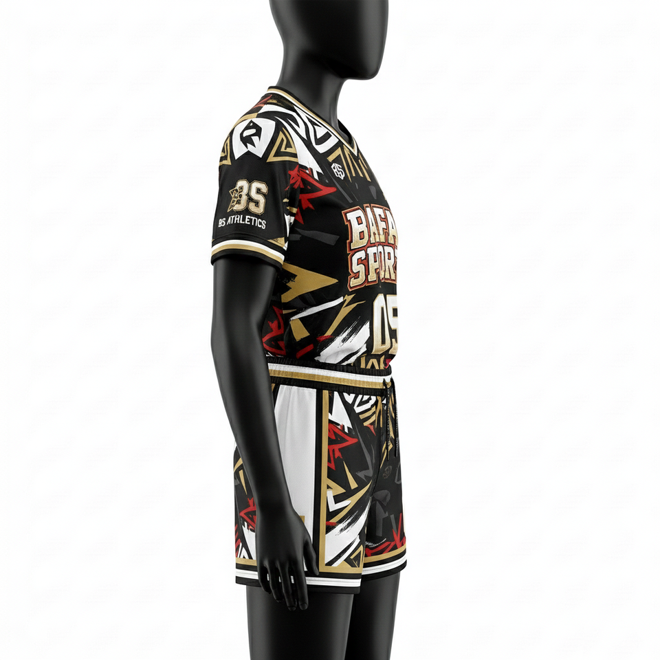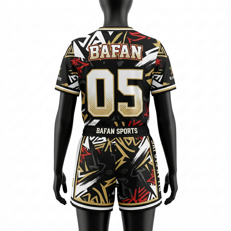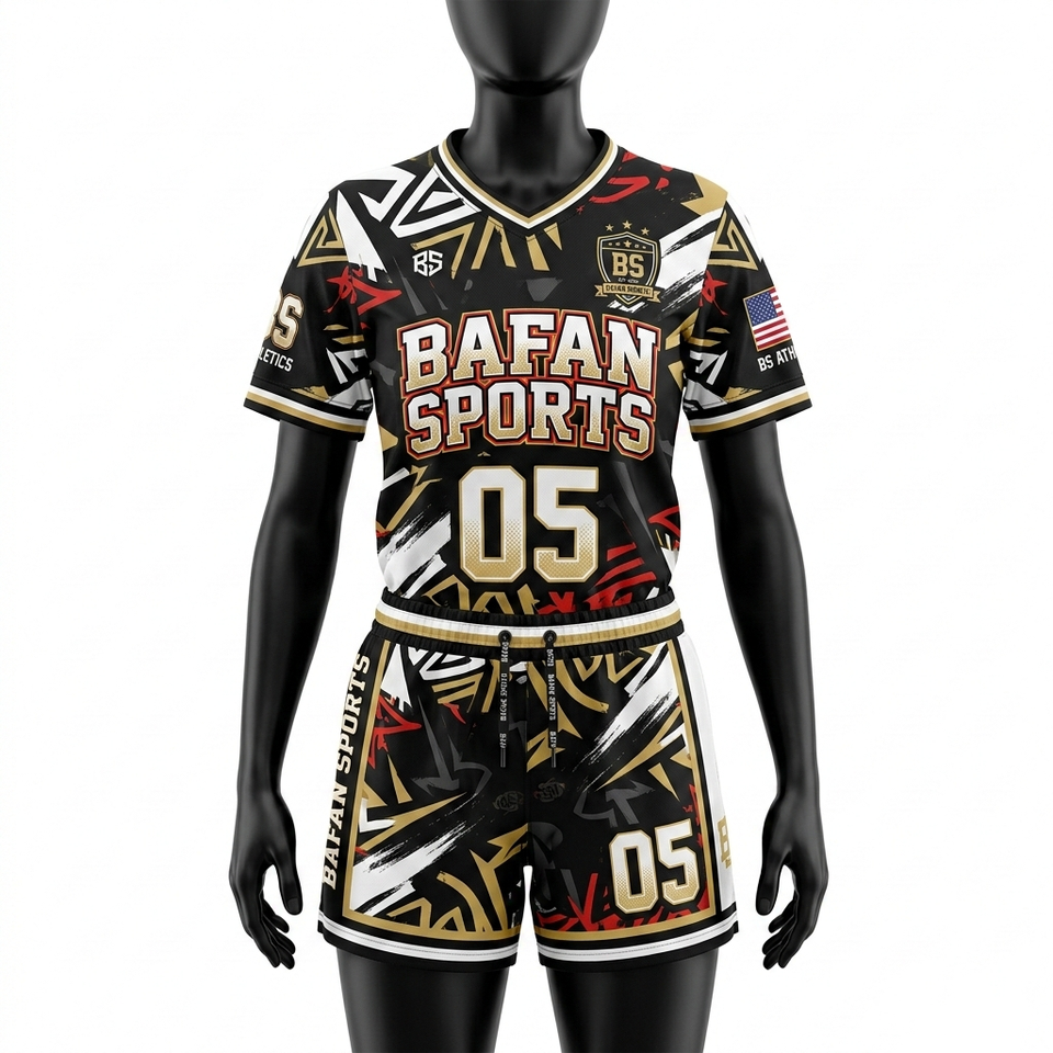 ชุดเสื้อฟุตบอลหญิงแบบสั้น ผ้าโพลีเอสเตอร์ตาข่าย ระบายเหงื่อได้ดี สีดำ ทอง ขาว ดีไซน์แผงสี รับสกรีนโลโก้ทีม ชุดสำหรับผู้หญิง