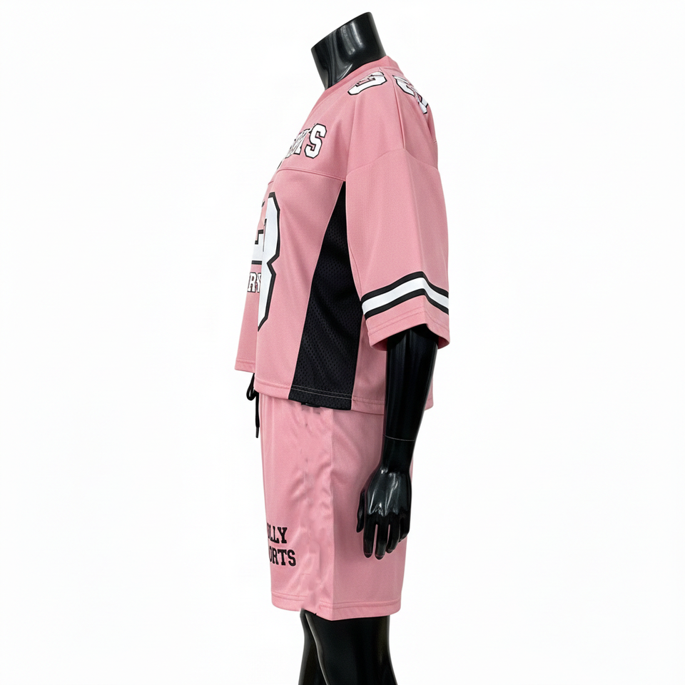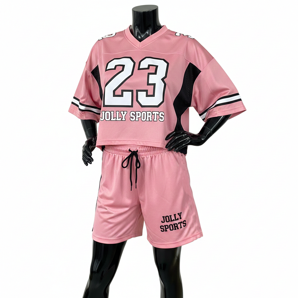 ชุดเสื้อฟุตบอลหญิงพร้อมกางเกงขาสั้น คุณภาพพรีเมียม โพลีเอสเตอร์ สำหรับออกกำลังกาย สีชมพู-ดำ แถบข้างสีดำ โลโก้สั่งทำได้ ชุดผู้หญิง ผ้าฝ้าย 100%
