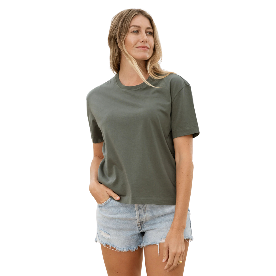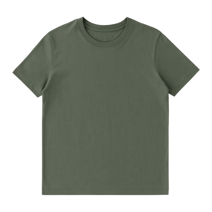 เสื้อยืดคอกลมแขนสั้นสีเขียวป่าสำหรับผู้หญิง ผลิตจากผ้าฝ้ายออร์แกนิคคุณภาพสูง 100% ผ่านการรับรอง GOTS เนื้อผ้านุ่ม ระบายอากาศได้ดี