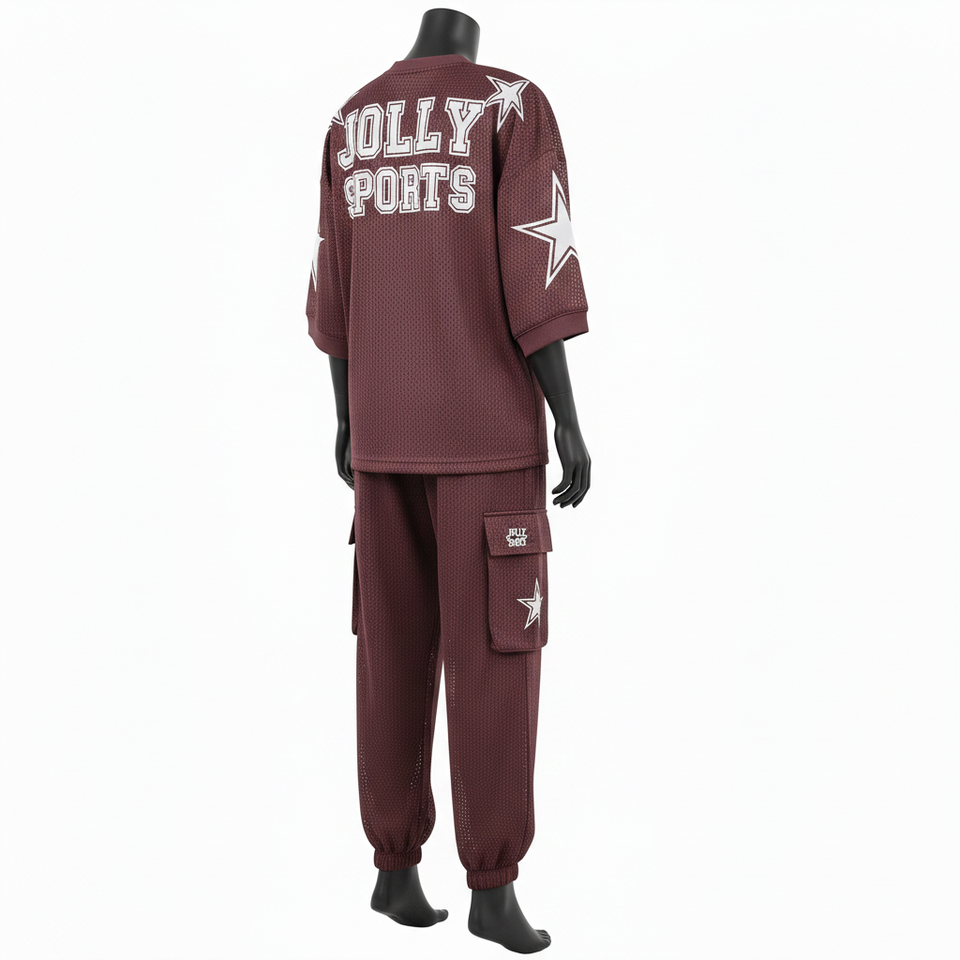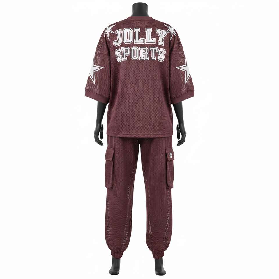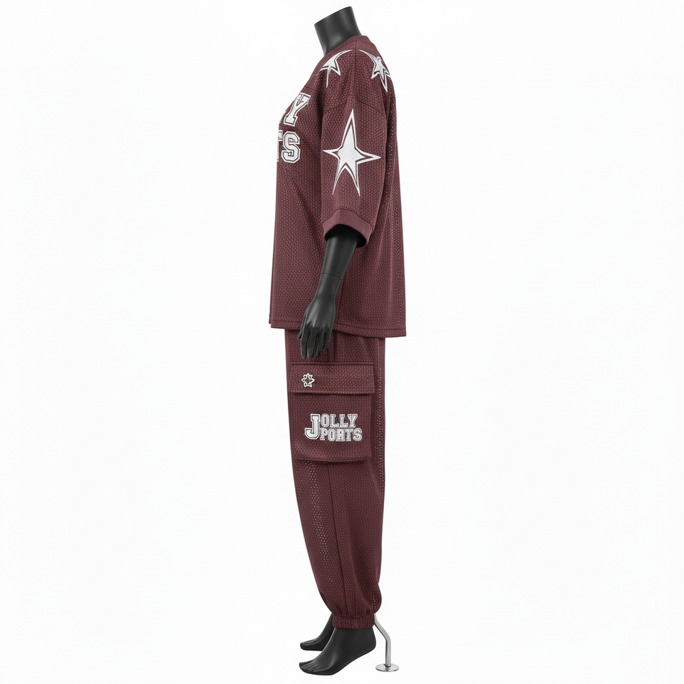ชุดกางเกงเจอร์ซีย์ตาข่ายโพลีเอสเตอร์พรีเมียมสำหรับผู้หญิง สีแดงเลือดหมู พิมพ์ลายซับลิเมชั่น โลโก้สกรีนแบบกำหนดเอง เจอร์ซีย์ตาข่ายและกางเกง ชุดสำหรับผู้หญิง