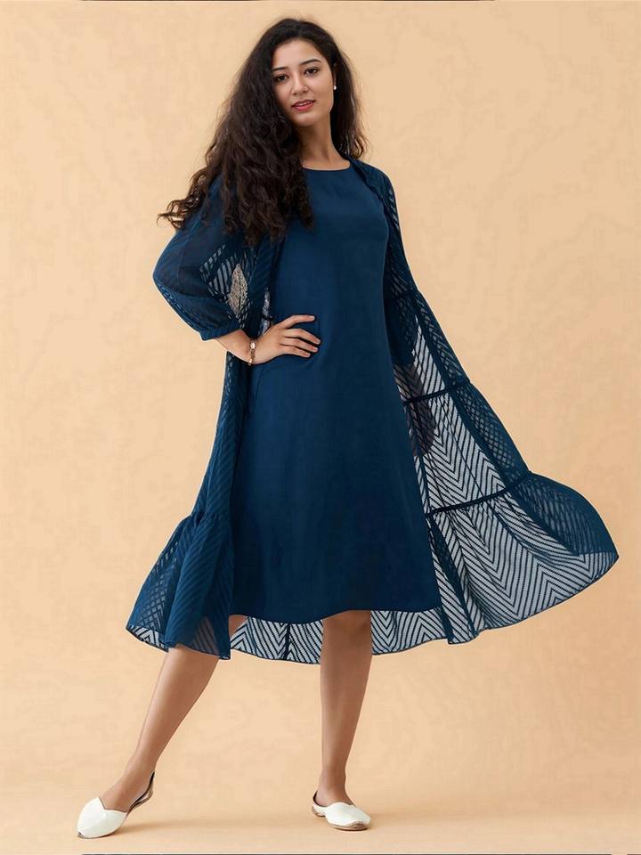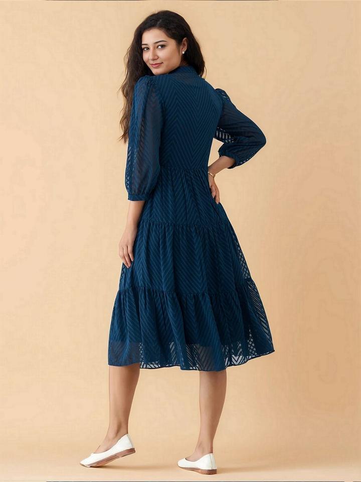 เดรสมิดิผู้หญิงพิมพ์ลายเรขาคณิตแขนพองผ้าเครปที่มีน้ำหนักเบา