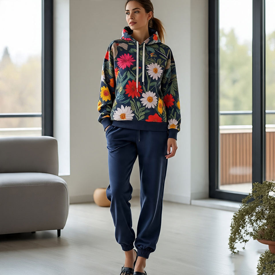 ชุดกีฬาพิมพ์ลายกราฟิกสำหรับผู้หญิงชุดออกกำลังกายพิมพ์ลายดิจิตอลชุดเสื้อผ้าสองชิ้นมีฮู้ดและกางเกงขายาวระบายอากาศได้