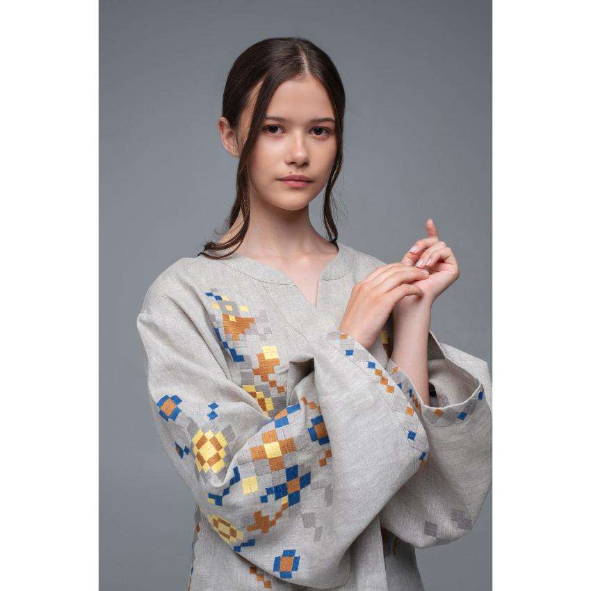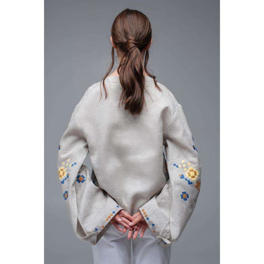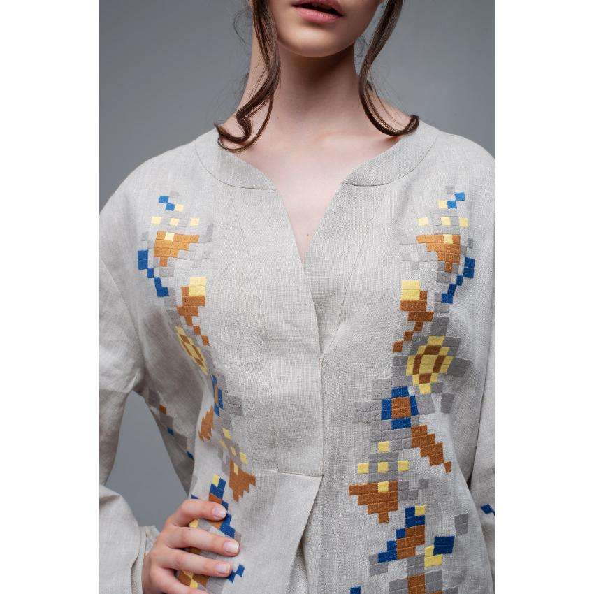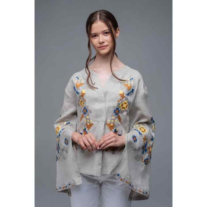 Women Grey Embroidered Linen Top Ethnic Handloom Style Blouse With Wide Sleeves