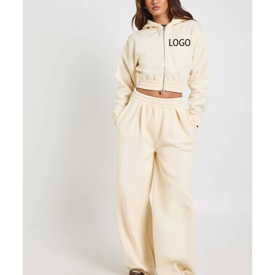 Women Gym Crop Hooded Training Jogging Suit Winter Print Embroidered Knitted Active Tracksuit French Terry Zipper ODM Sweatsuit