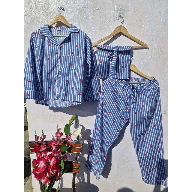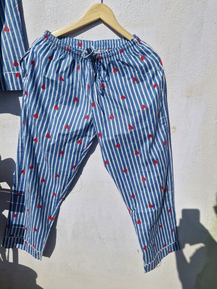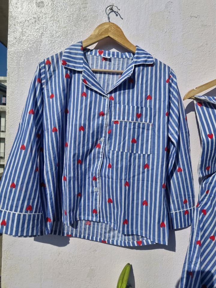 ชุดนอนผ้าฝ้ายลายหัวใจสำหรับผู้หญิง – เสื้อเชิ้ตติดกระดุมและกางเกงเอวยางยืด