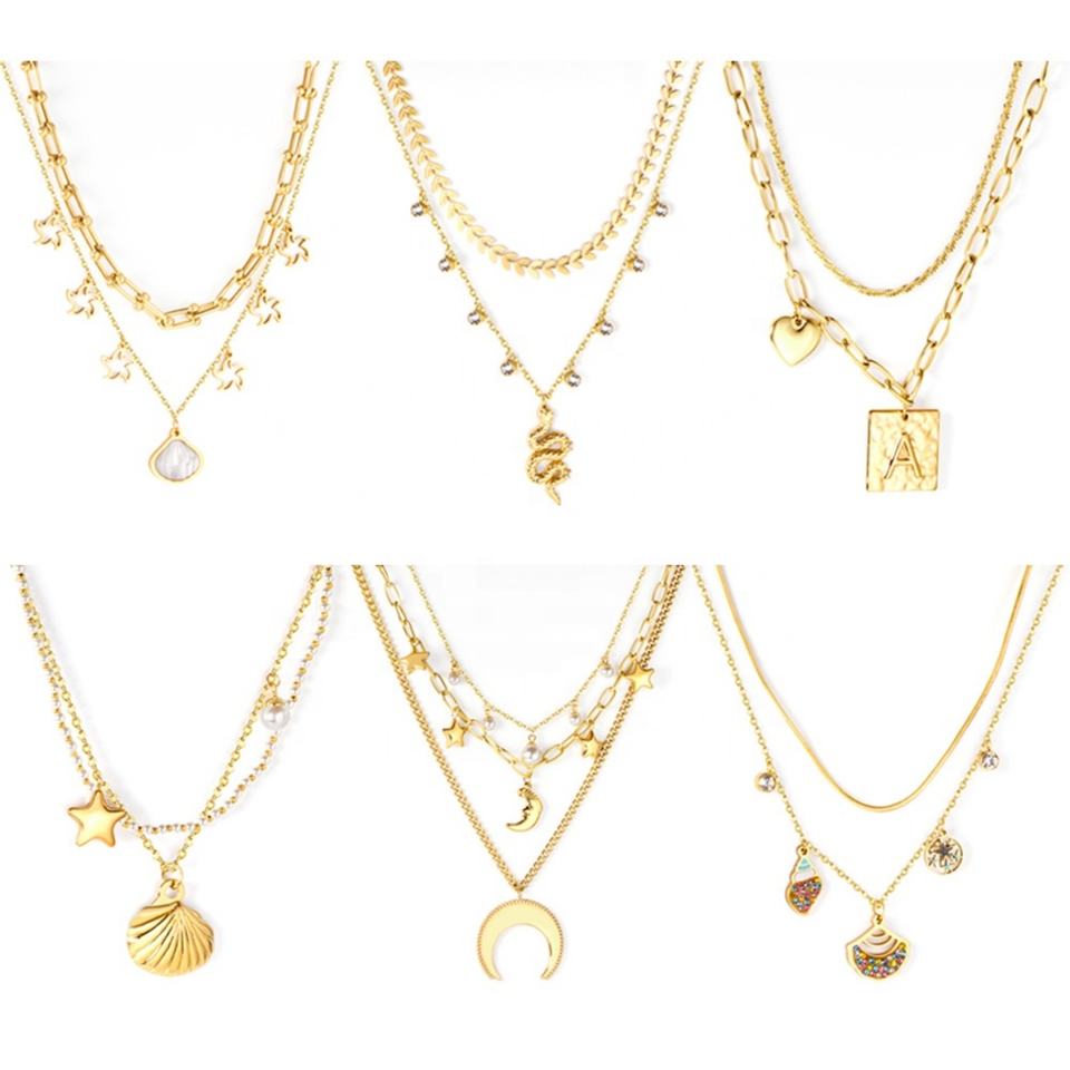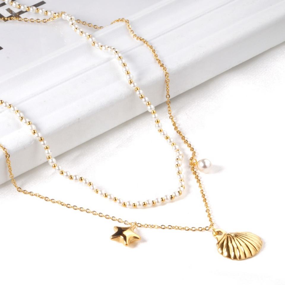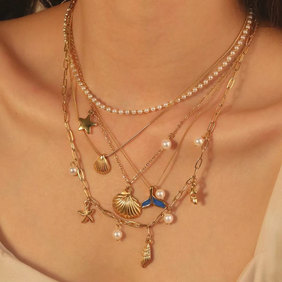 สร้อยคอผู้หญิงคุณภาพสูง ชุบทอง 18k PVD ลายเปลือกหอย ทะเล พระจันทร์ หัวใจ ดาว หลายชั้น สไตล์ฤดูร้อน