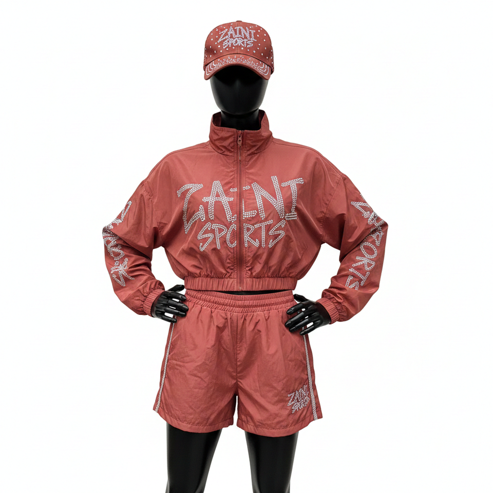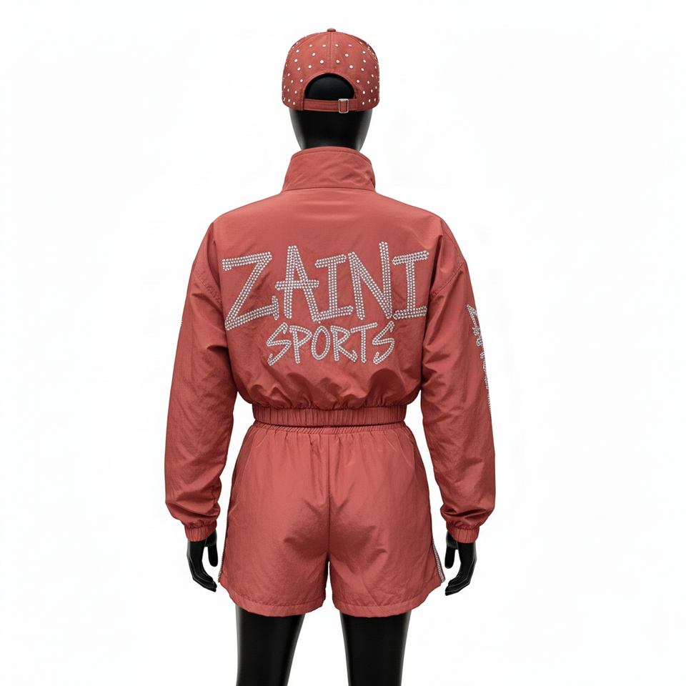 ชุดเซ็ตเสื้อแจ็คเก็ตกันลมและกางเกงขาสั้นผ้าโพลีเอสเตอร์คุณภาพสูงสำหรับผู้หญิง เนื้อผ้าเรียบลื่น พร้อมโลโก้คริสตัลแบบรีดร้อน ไซส์พลัส
