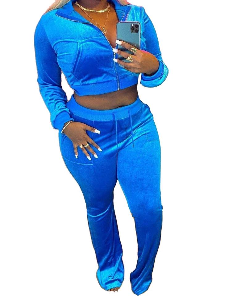 ชุดวอร์มผ้ากำมะหยี่แบบสองชิ้นสำหรับผู้หญิงเสื้อสเวตเตอร์มีฮู้ดแบบรูดซิปกางเกงขาบานขายส่ง