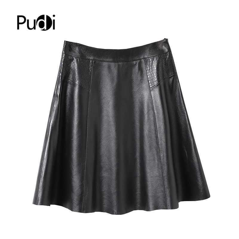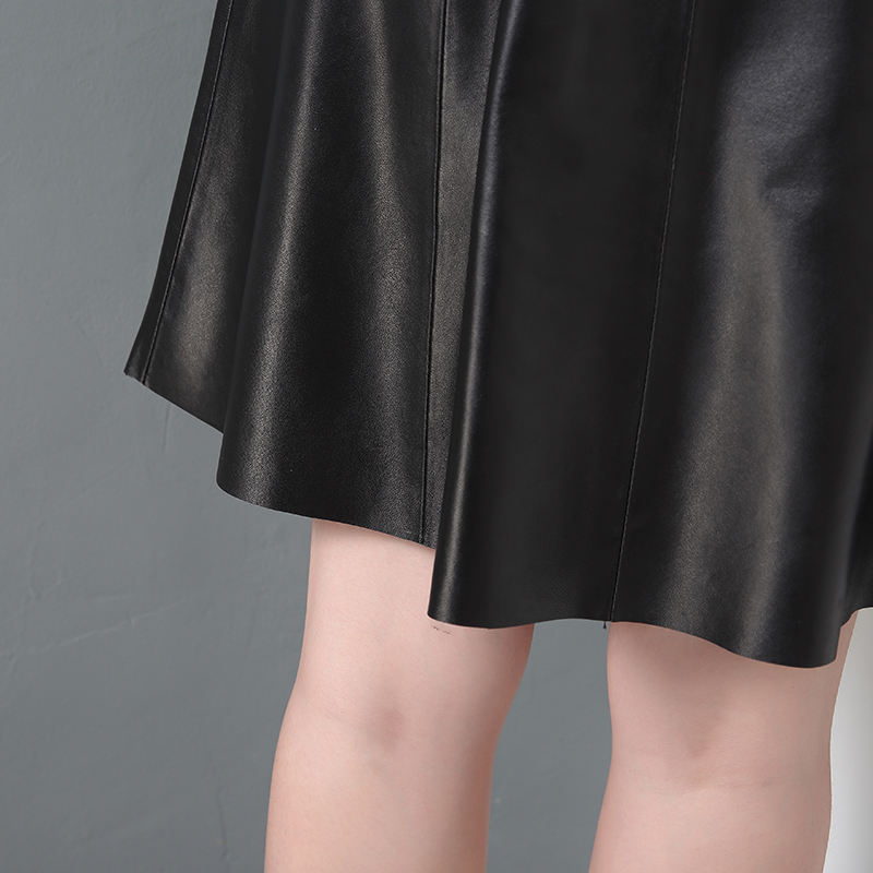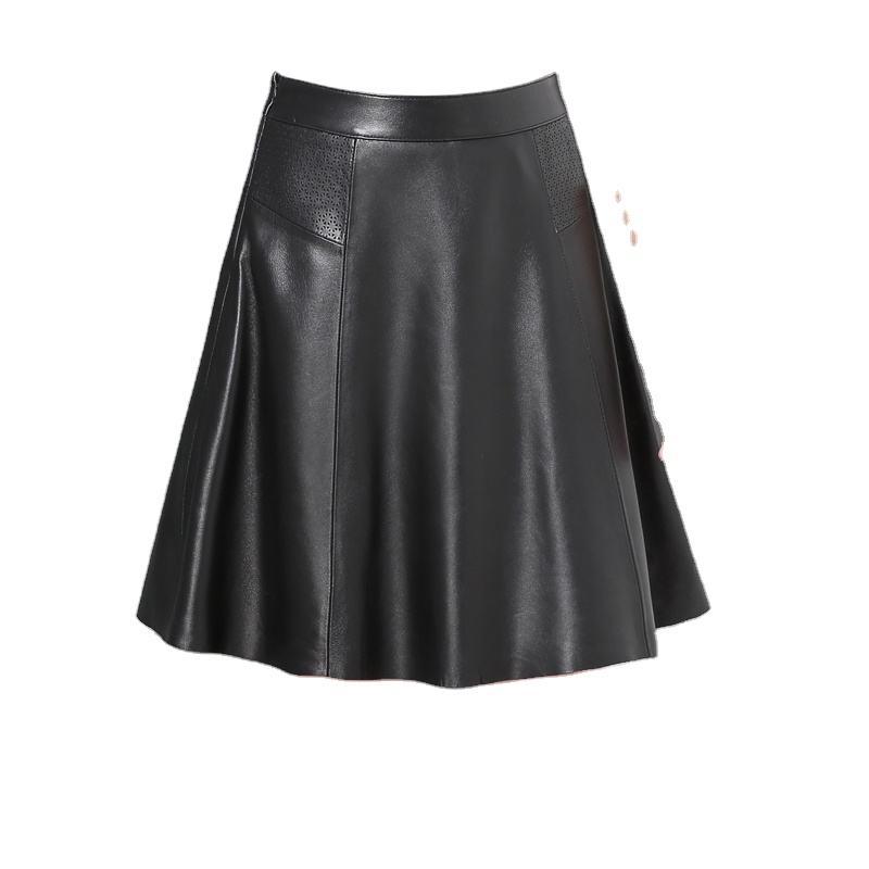 กระโปรงหนังทรงเอเอวสูงสีดำสำหรับผู้หญิง แบบมีรูระบายอากาศ ความยาวระดับเข่า แฟชั่น OEM รับผลิตตามแบบ กระโปรงหนังสำหรับสุภาพสตรี