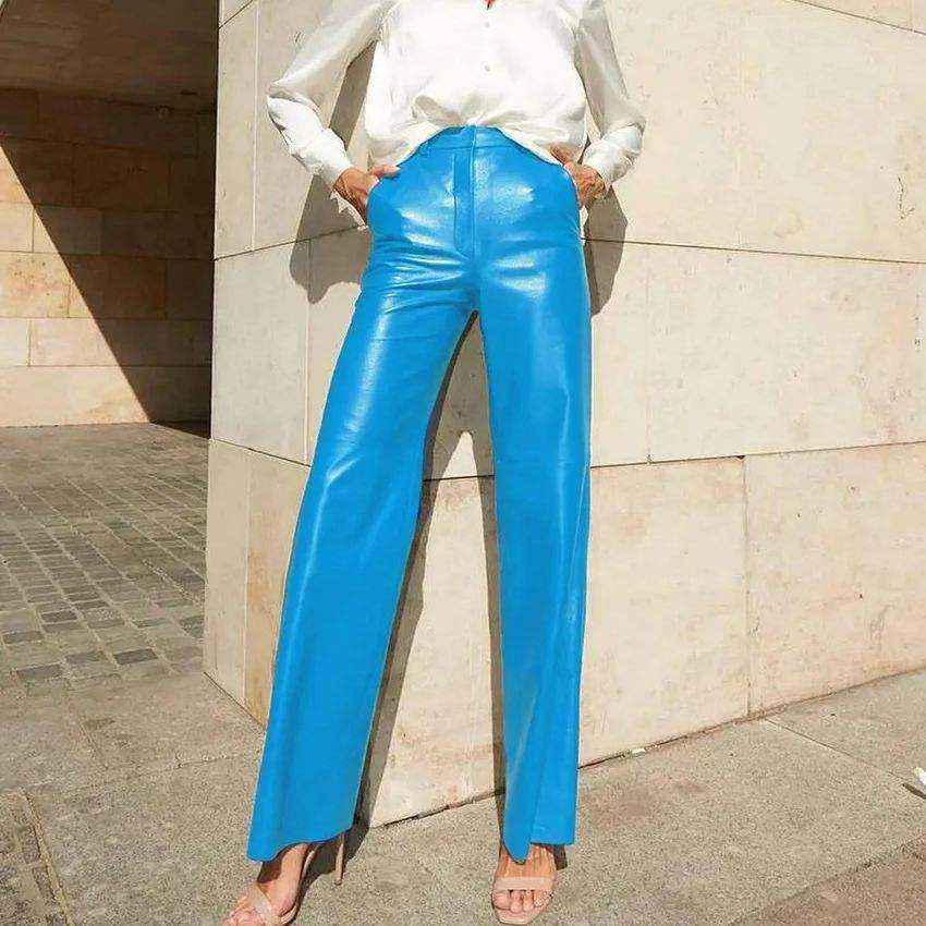กางเกงหนังเอวสูงทรงตรงขาบานสไตล์ Wet Look ผ้ายืด ซิปและกระดุม ปิดปลายขาแบบยาว