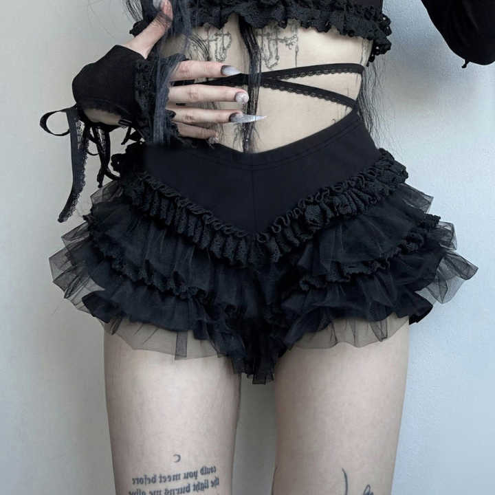 กางเกงขาสั้นสไตล์โกธิคสำหรับผู้หญิง แต่งระบายหลายชั้น เอวสูง ผ้าตาข่ายบางเบา แฟชั่นสีเข้ม สไตล์ลำลอง