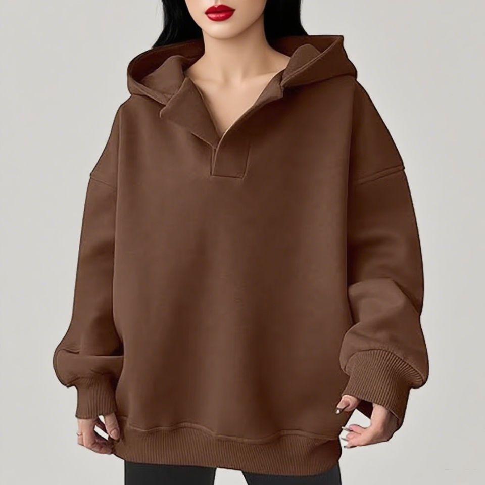 เสื้อสเวตเตอร์คอวีมีฮู้ดสำหรับผู้หญิงเสื้อสเวตเตอร์แบบสวมหัวแขนยาวผ้าคอตตอนฟลีซใส่สบายเสื้อผ้า2025ฤดูใบไม้ร่วง