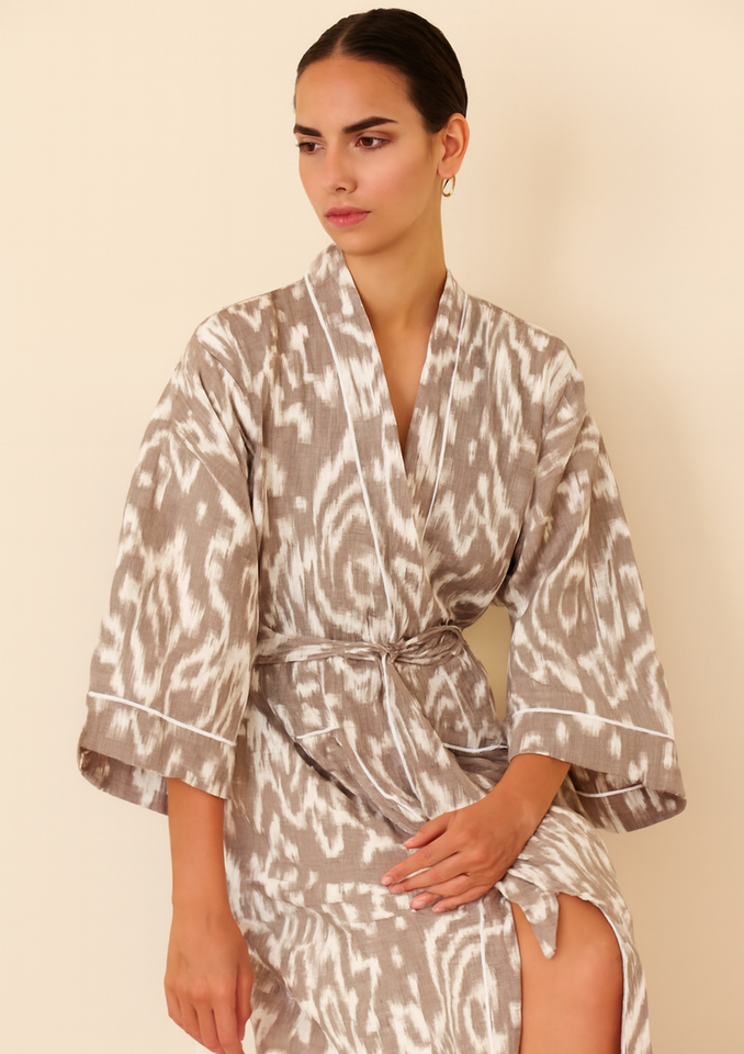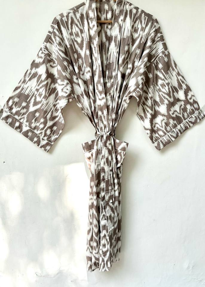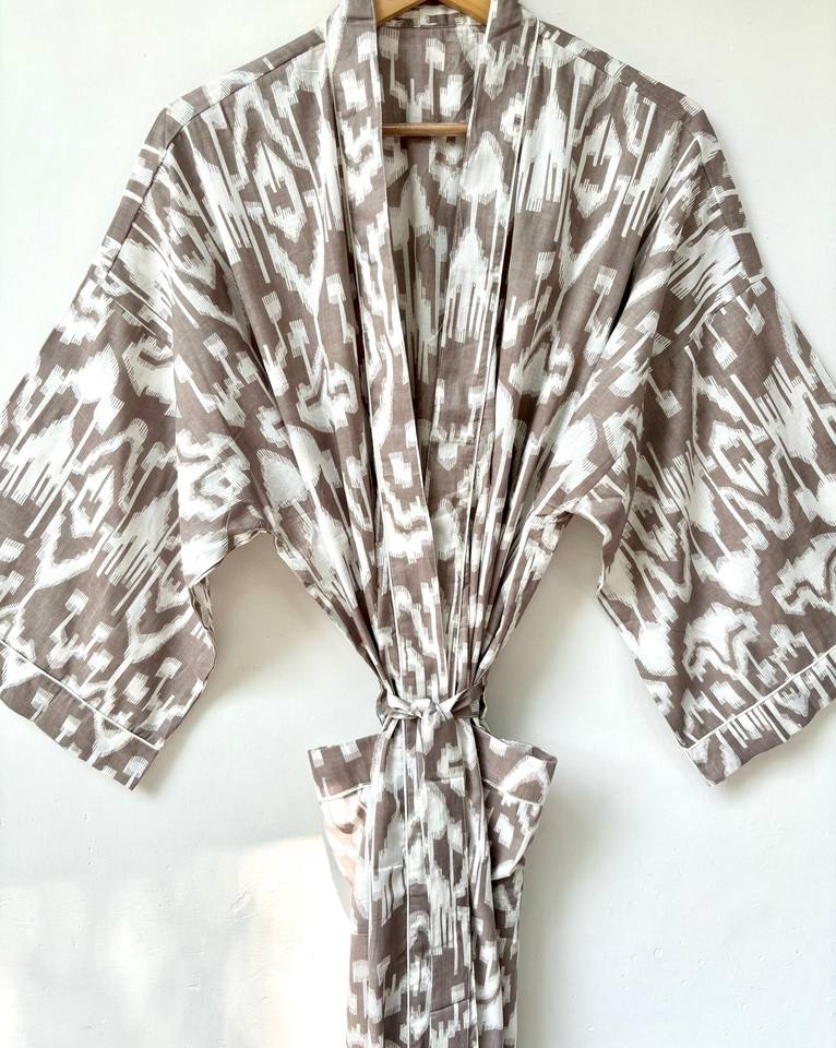 ชุดกิโมโนผ้าฝ้ายพิมพ์ลายทำมือสำหรับผู้หญิงในเทศกาลอินเดีย แห้งเร็ว คอวี เหมาะสำหรับใส่ชายหาดช่วงฤดูร้อน ความยาวเต็มตัว