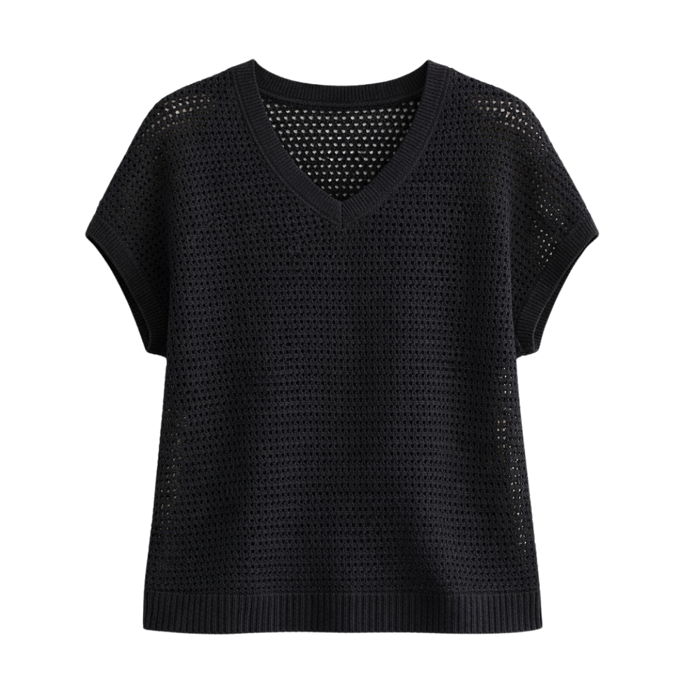 เสื้อสเวตเตอร์ไหมพรมถักลายโปร่ง คอวี แขนสั้น ระบายอากาศได้ดี เนื้อผ้ามีเท็กซ์เจอร์ สไตล์ลำลองสำหรับฤดูร้อน ทรงหลวม แฟชั่นเสื้อพูลโอเวอร์สำหรับผู้หญิง