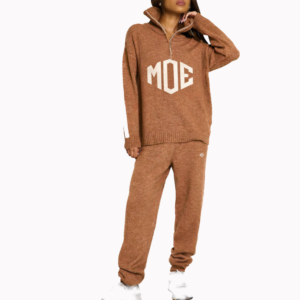 ชุดเสื้อสเวตเชิ้ตคอซิปถักนิตติ้งและกางเกงจ็อกเกอร์เนื้อผ้านุ่มสบายสำหรับผู้หญิง เหมาะสำหรับการผลิตแบบ OEM และขายส่ง
