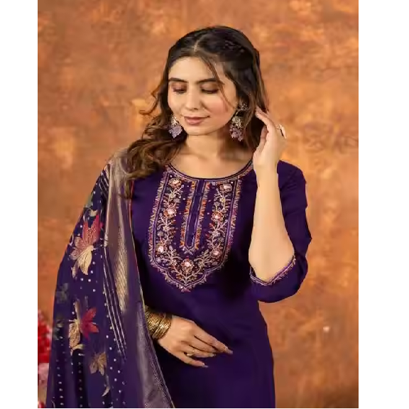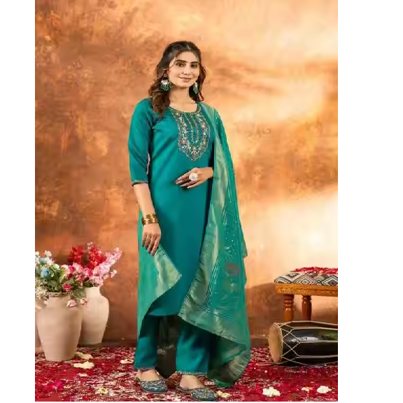 Women Kurti Pant Dupatta Set With Artistic Multi Embroidery Thread Hand Work For Ethnic Wear Parties Festivals Cultural Function