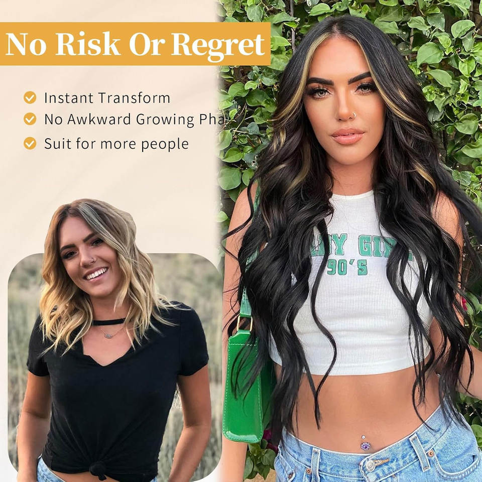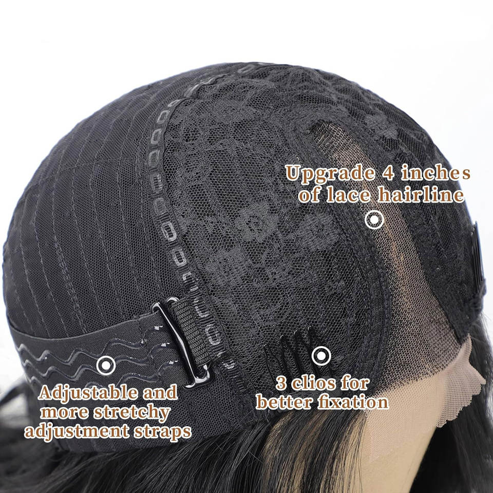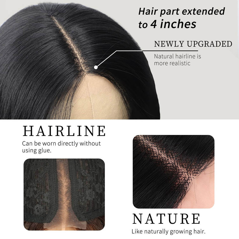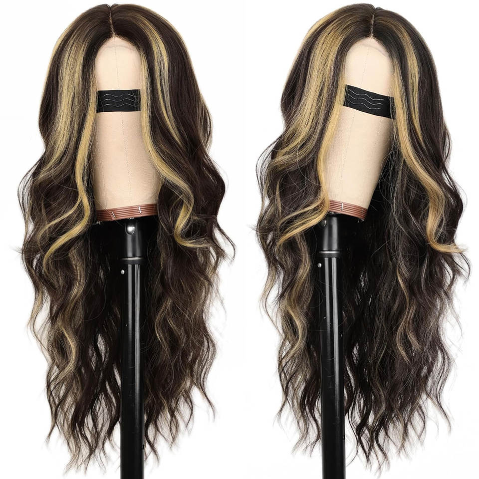 วิกผมสังเคราะห์ด้านหน้าเป็นลอนสำหรับผู้หญิงผมยาวนุ่มใส่สบายผมสำหรับปาร์ตี้สีน้ำตาลเข้มพร้อมไฮไลต์สีบลอนด์