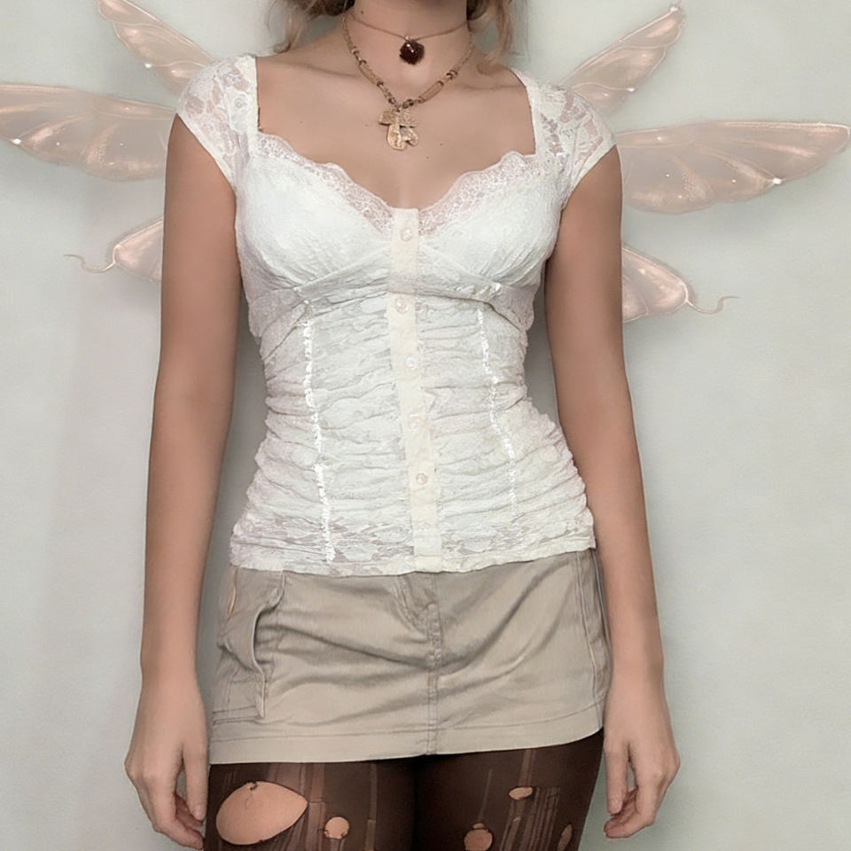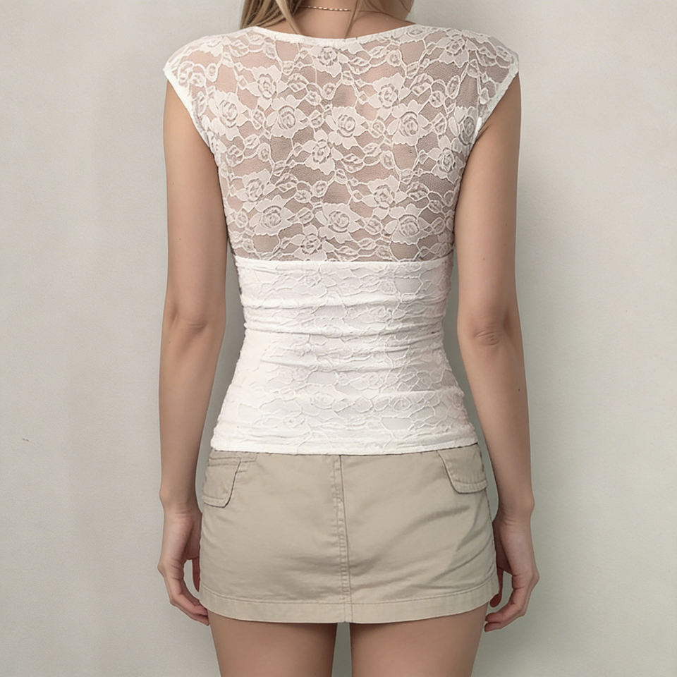 เสื้อยืดแขนสั้นคอวีแต่งระบายลูกไม้ติดกระดุมด้านหน้าทรงเข้ารูปสำหรับผู้หญิง เสื้อถักแฟชั่นลำลองสำหรับฤดูร้อน