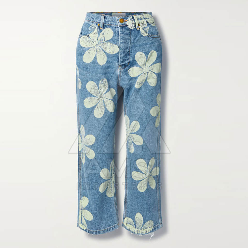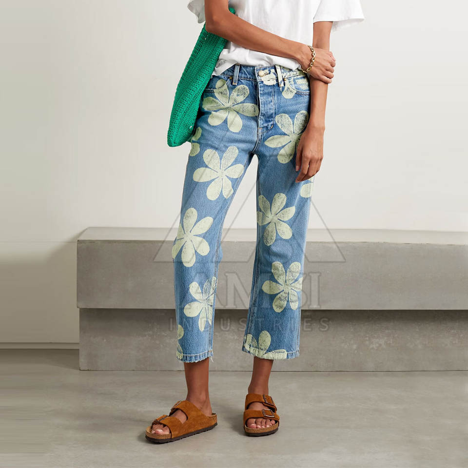 กางเกงยีนส์เอวสูงสำหรับผู้หญิง,กางเกงยีนส์พิมพ์ลายดอกไม้แฟชั่นฤดูร้อน
