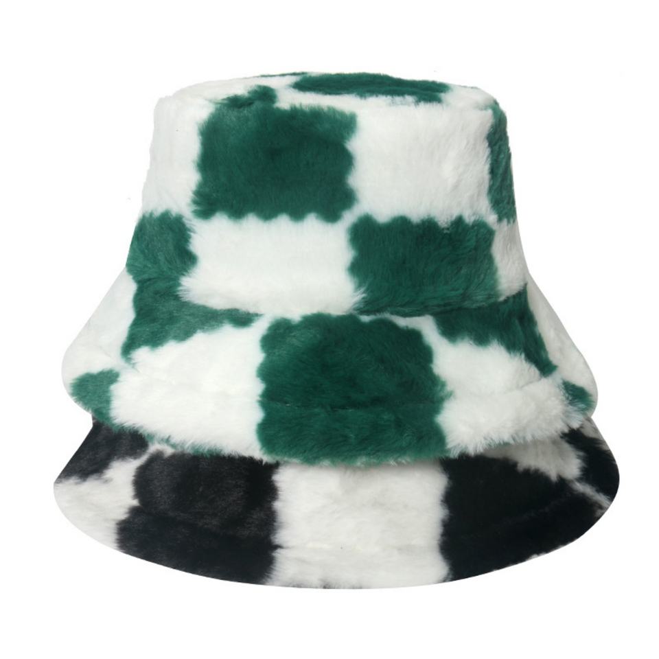 หมวกบักเก็ตขนเฟอร์เทียมลายตารางหมากรุกสำหรับผู้หญิง ผ้าขนสัตว์หนานุ่ม อุ่นสบาย เหมาะสำหรับตกปลา ท่องเที่ยว ฤดูหนาว