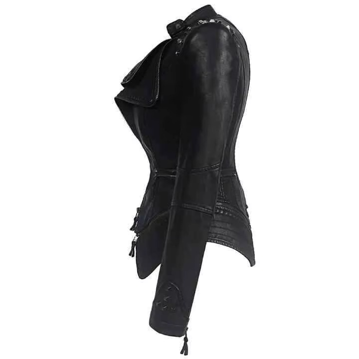 เสื้อแจ็คเก็ตหนังผู้หญิง สีดำ ประดับหมุด ทรงเข้ารูป ซิปหลายช่อง สไตล์พังก์ร็อก รับผลิตแบบ OEM สำหรับแบรนด์ส่วนตัว