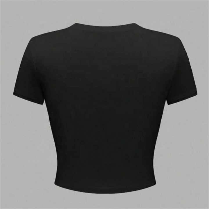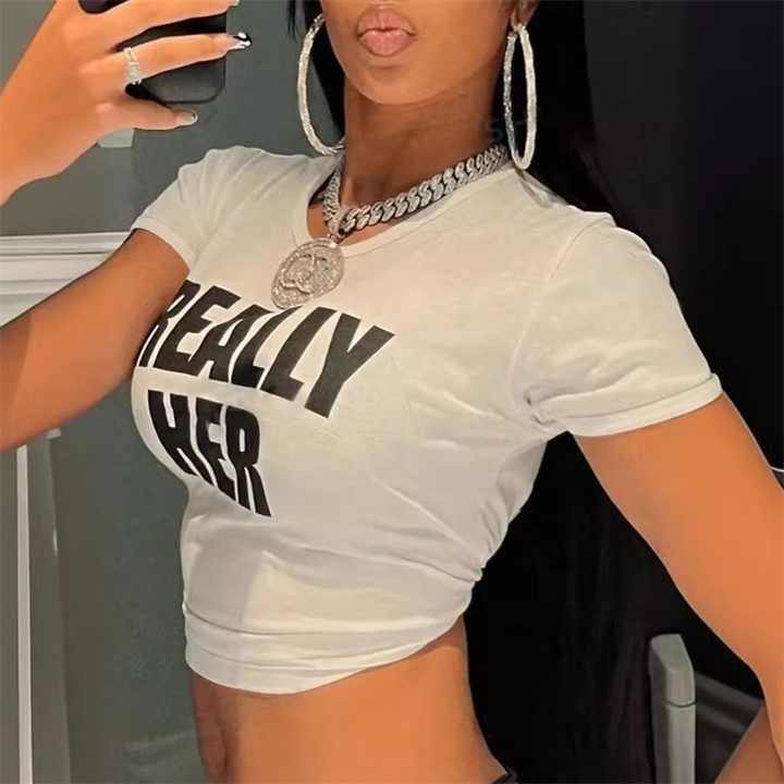 เสื้อยืดพิมพ์ลายตัวอักษรสำหรับผู้หญิงเสื้อครอปทรงพอดีตัวเสื้อยืดลำลองย้อนยุคเสื้อแนวสตรีทเสื้อสุดเซ็กซี่