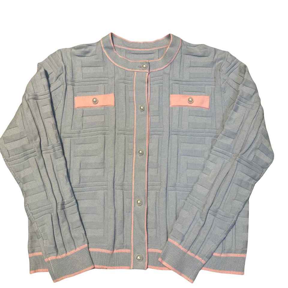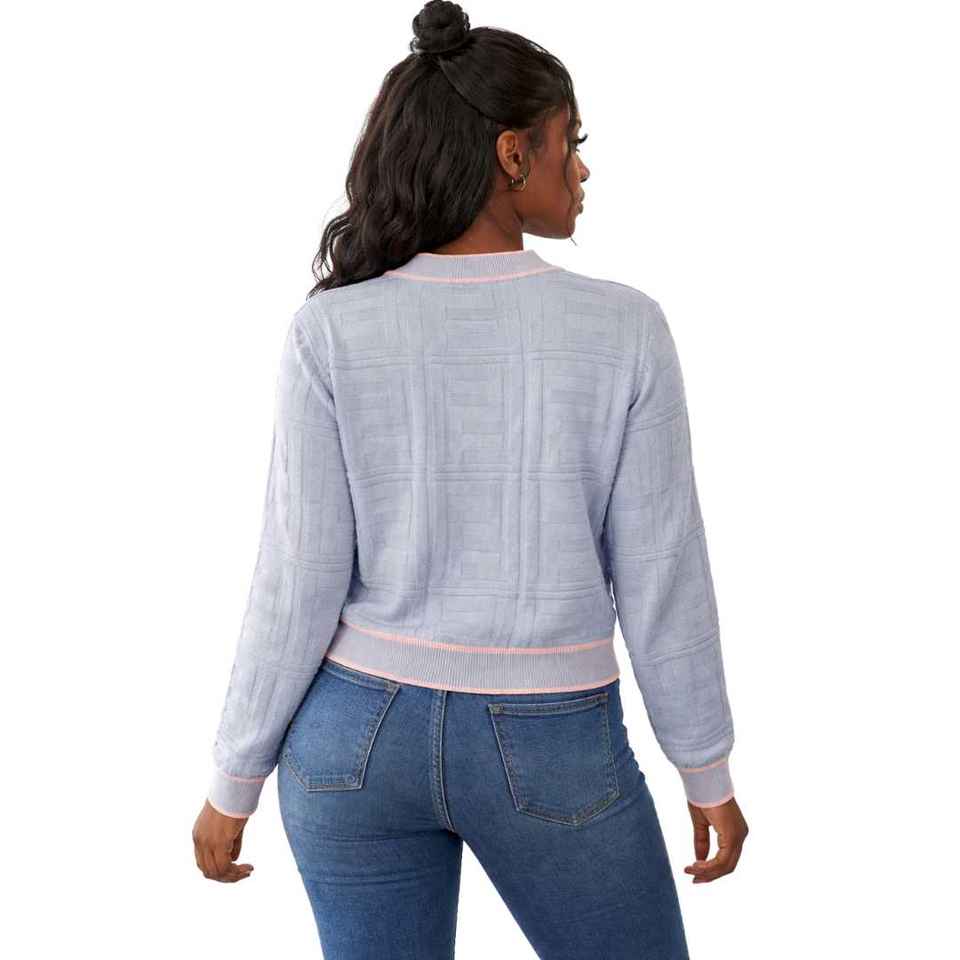 เสื้อคาร์ดิแกนไหมพรมสีฟ้าอ่อนสำหรับผู้หญิง แขนยาว สวมใส่สบาย เหมาะสำหรับใส่ทำงาน แต่งขอบตัดสี รับผลิตตามแบบ (OEM) ขายส่ง ฤดูหนาว ผลิตจากอะคริลิก 100%