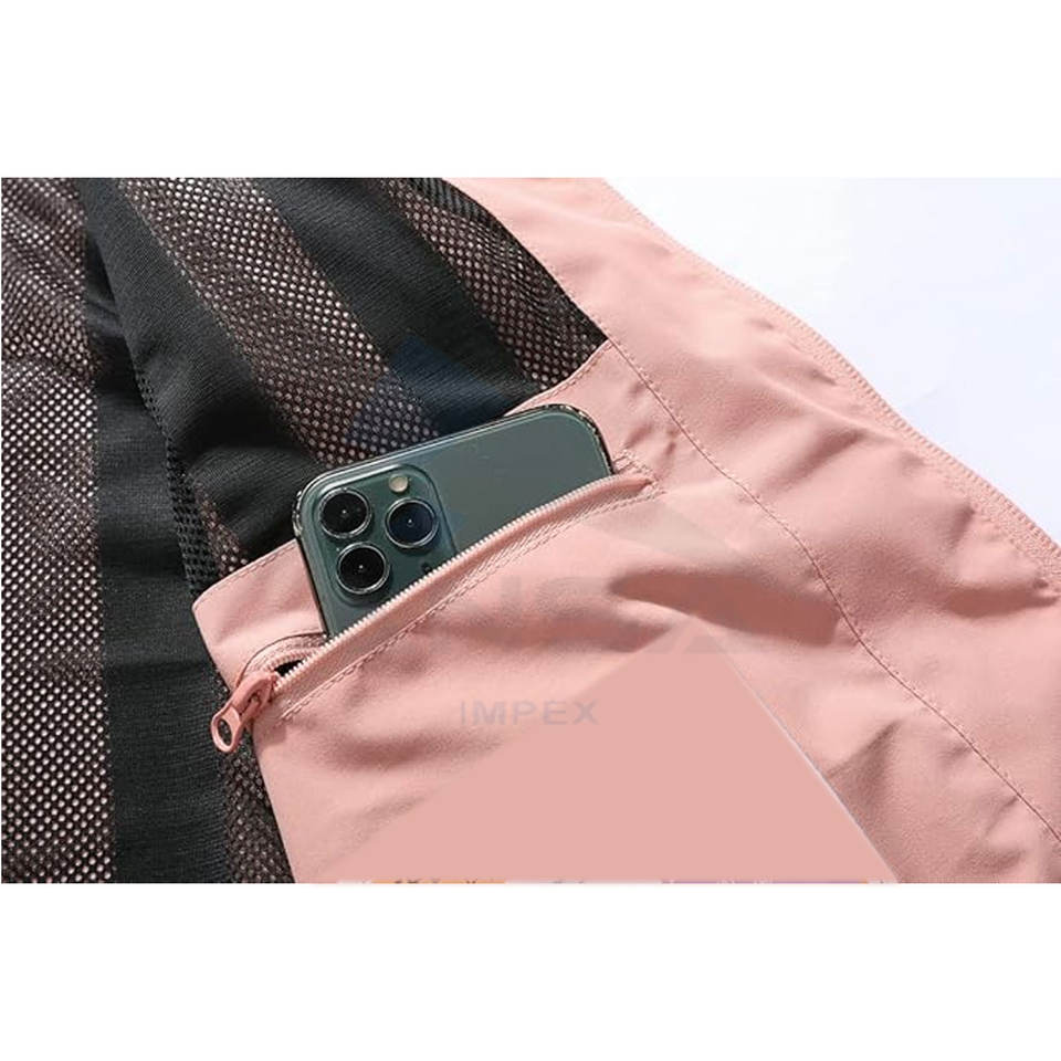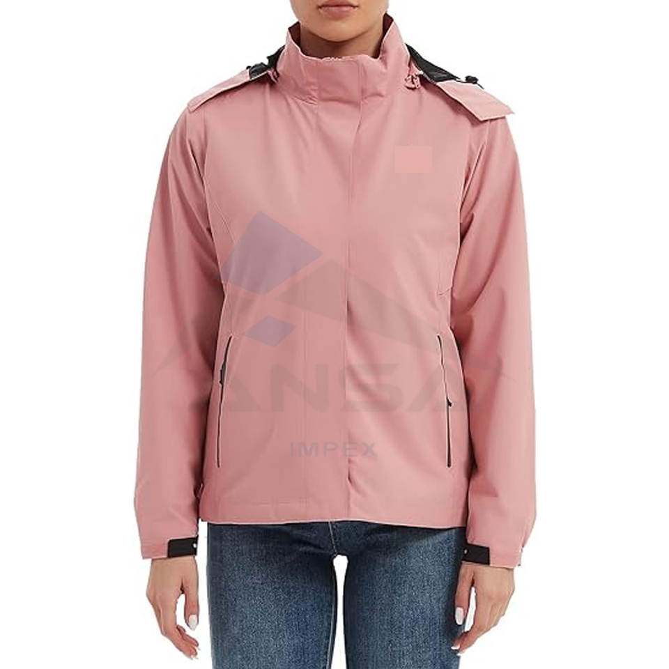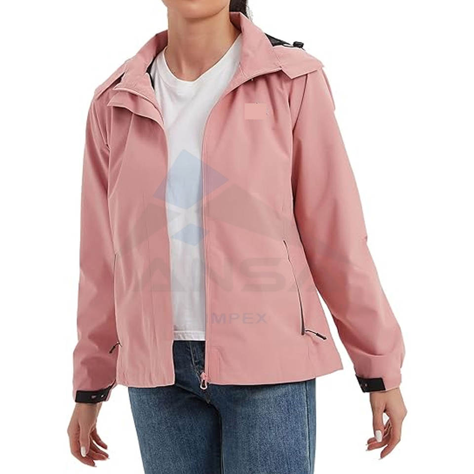 เสื้อกันฝนแบบมีฮู้ดน้ำหนักเบาสำหรับผู้หญิง เสื้อแจ็คเก็ตกันน้ำสำหรับเดินป่า เสื้อแจ็คเก็ตกันลมแบบซอฟต์เชล สีชมพู