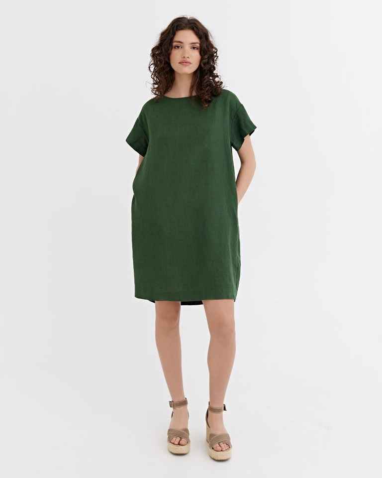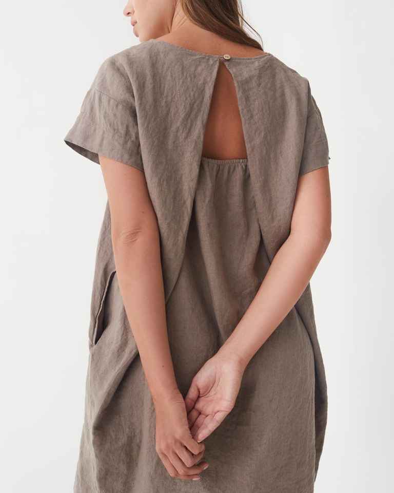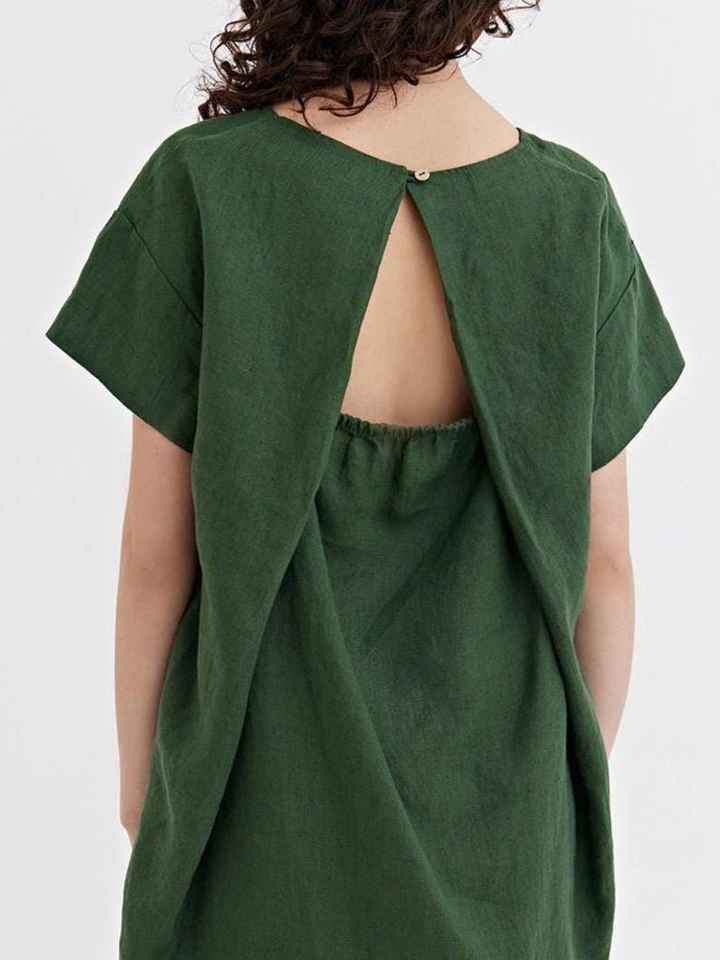 ชุดเดรสผ้าลินินผสมทรงเอ คอ halter แขนสั้น สไตล์ลำลองสำหรับฤดูร้อน เป็นมิตรกับสิ่งแวดล้อม ซักได้ ติดกระดุม ย้อมสีพื้น