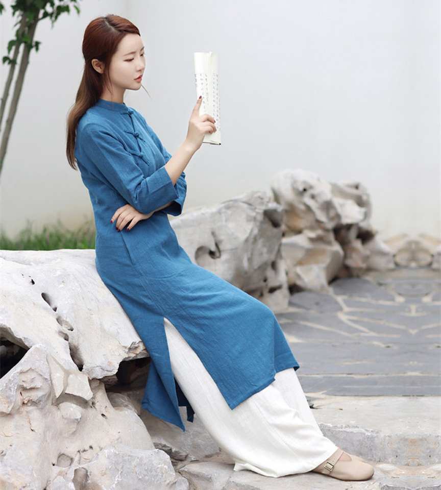 ชื่อสินค้า:ชุดเดรสผ้าลินินยาวปานกลาง แขนยาว ทรงทูนิค