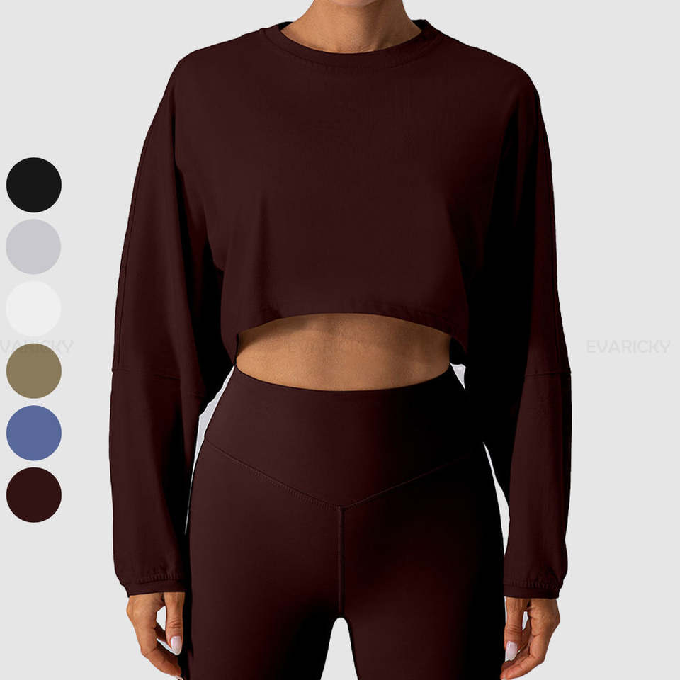 ชุดเสื้อครอปแขนยาวสำหรับผู้หญิง ผ้าระบายอากาศ แห้งเร็ว เหมาะสำหรับโยคะและออกกำลังกาย ผลิตจากผ้าสแปนเด็กซ์และไนลอน สีพื้น คอกลม