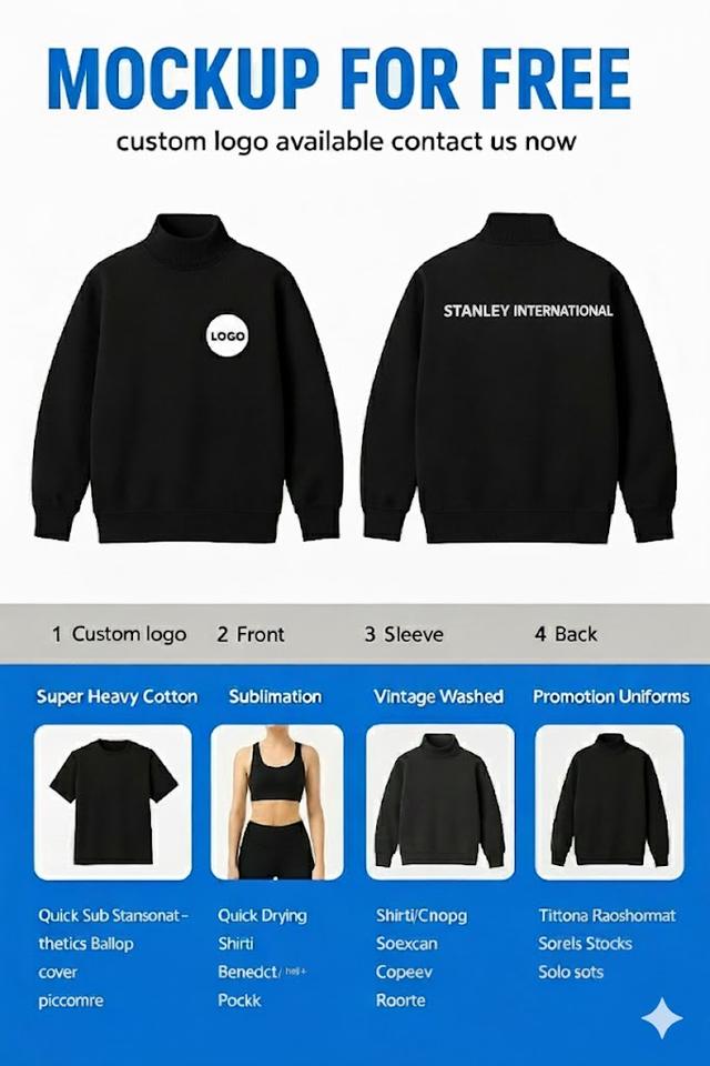 Logo position:Front, back, Left Sleeve, Right Sleeve, lower hem, back neck