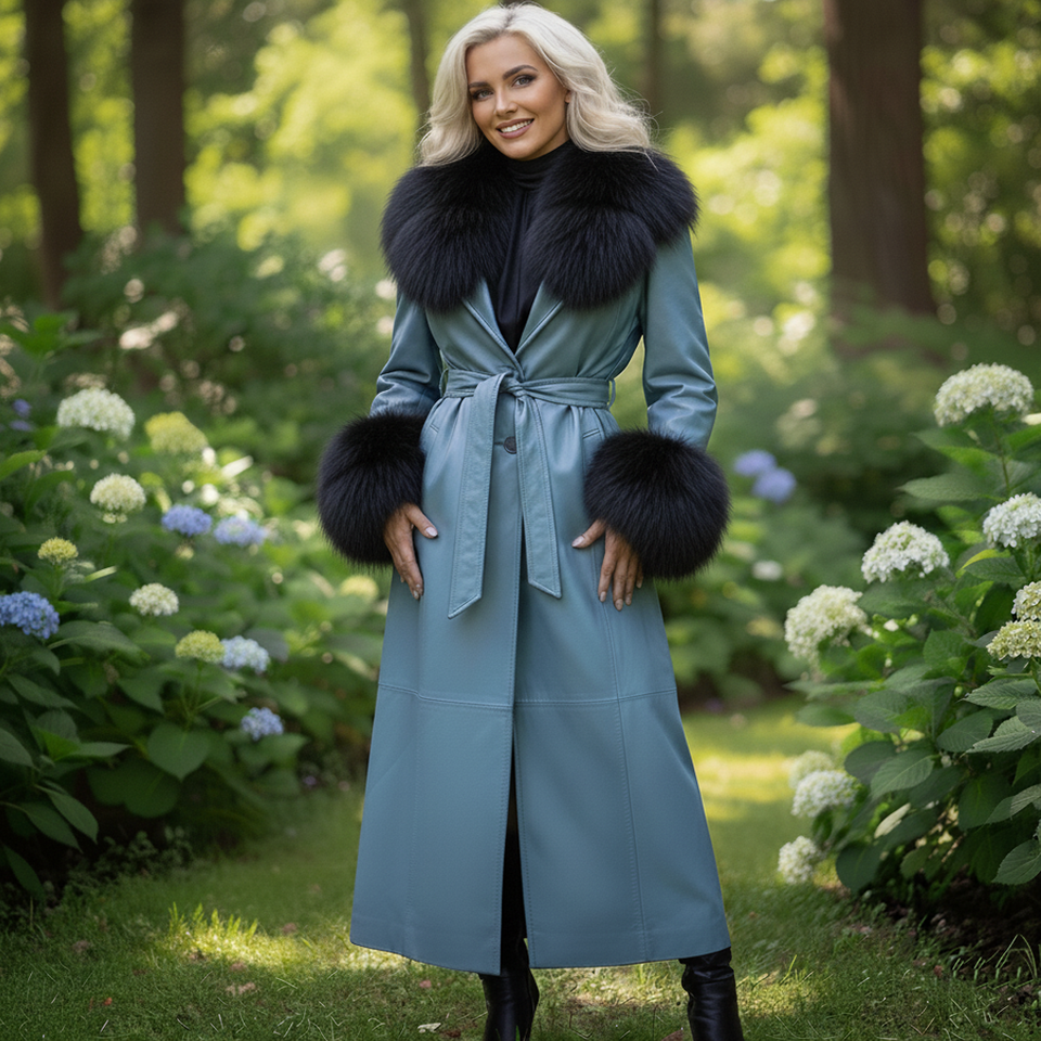 เสื้อโค้ทเทรนช์หนังปลาแบบยาวสไตล์วินเทจสำหรับผู้หญิง ดีไซน์เข็มขัด แต่งปกขนฟ็อกซ์ ซับในผ้าไหม กันลม ขายส่งแบบสั่งทำ
