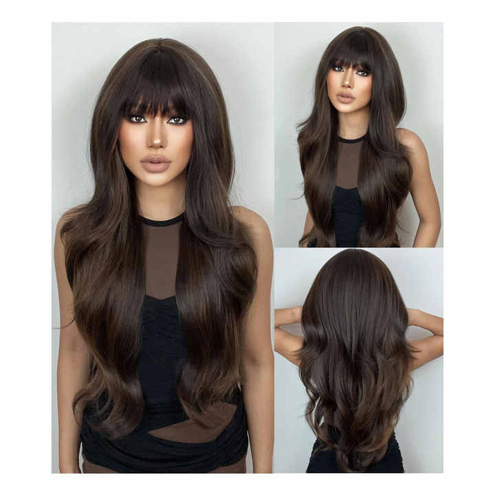 วิกผมยาวหยักศกสีน้ำตาลเข้มสำหรับผู้หญิงวิกผมยาวทำจากเส้นใยทนความร้อนดูเป็นธรรมชาติ