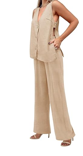 ชุดสองชิ้นผ้าฝ้ายสีเบจทรงหลวมสำหรับผู้หญิงเสื้อแขนกุดคอวีลึกพร้อมกางเกงขากว้างแบบลำลองและใส่สบาย