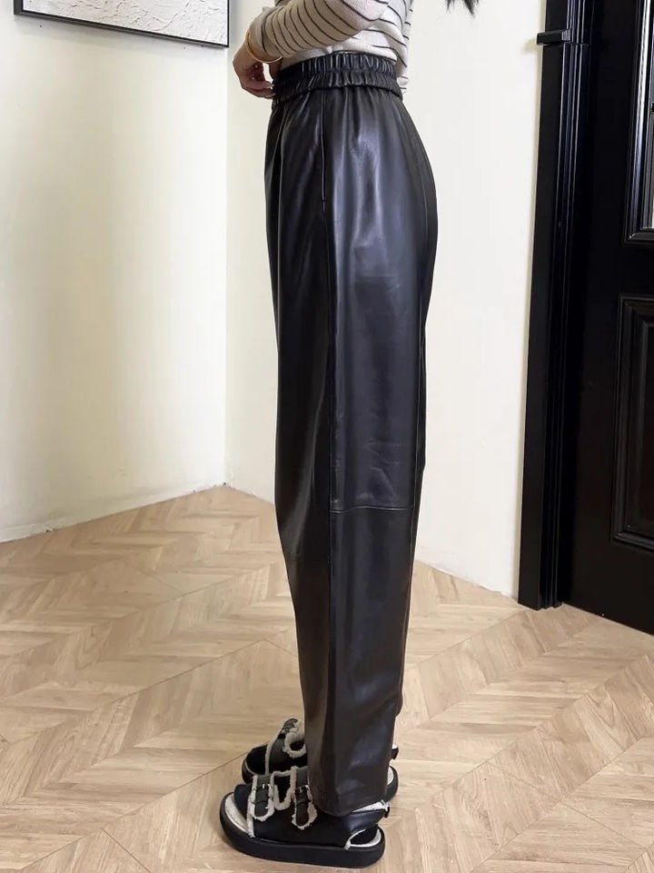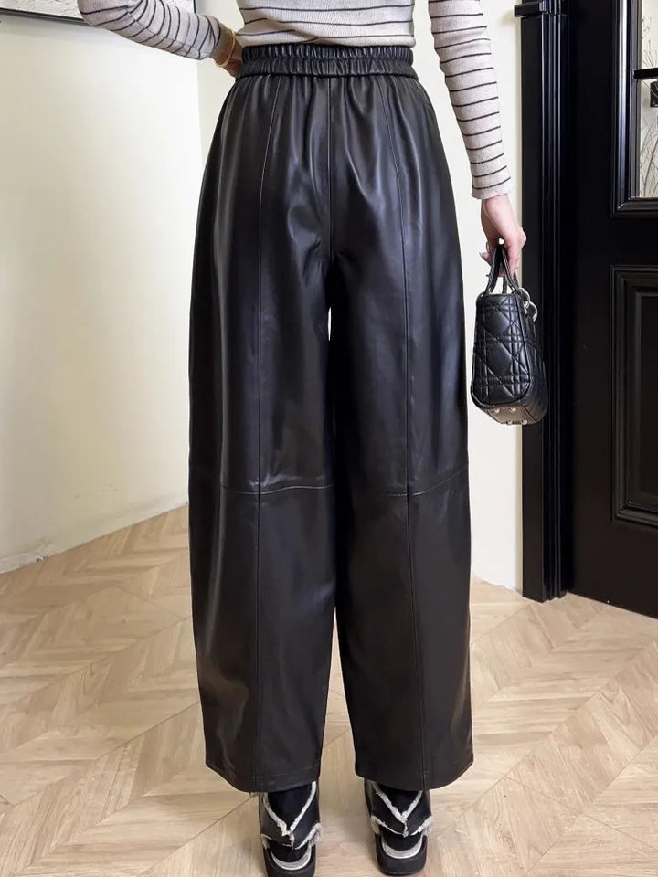 กางเกงฮาเร็มหนังแกะแท้ทรงหลวมสำหรับผู้หญิง เอวยางยืด กางเกงหนังแท้ สไตล์ลำลอง สตรีทแวร์ ฤดูใบไม้ร่วง รุ่นใหม่ กางเกงใส่สบาย