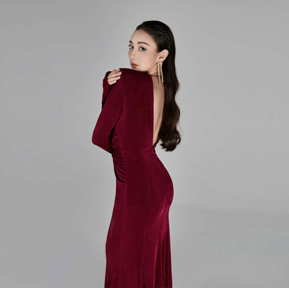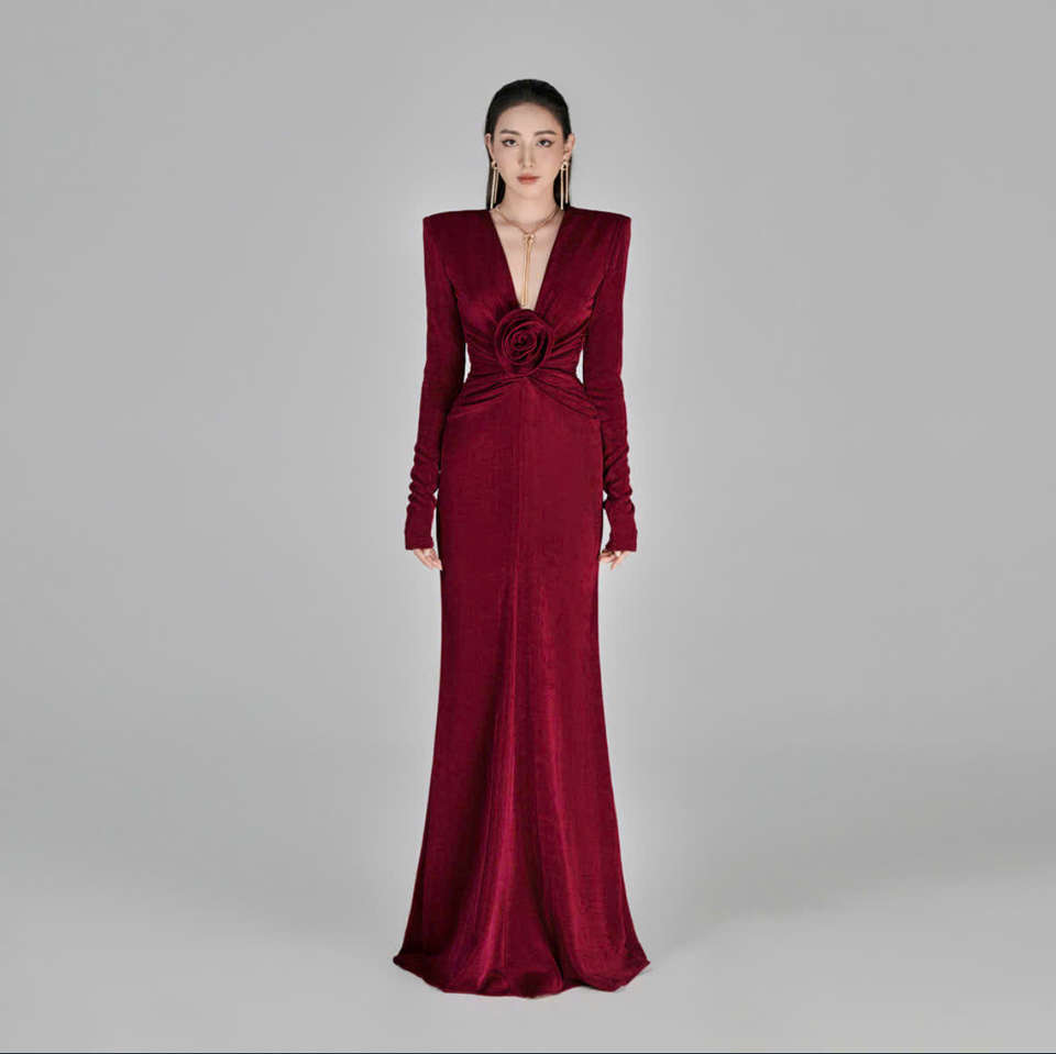 ชุดราตรีกำมะหยี่สีแดงหรูหราสำหรับผู้หญิง คอวีลึก แขนยาว ประดับดอกไม้ 3 มิติ ชุดออกงานสั่งตัดได้ รับผลิตแบบ OEM ODM เวียดนาม