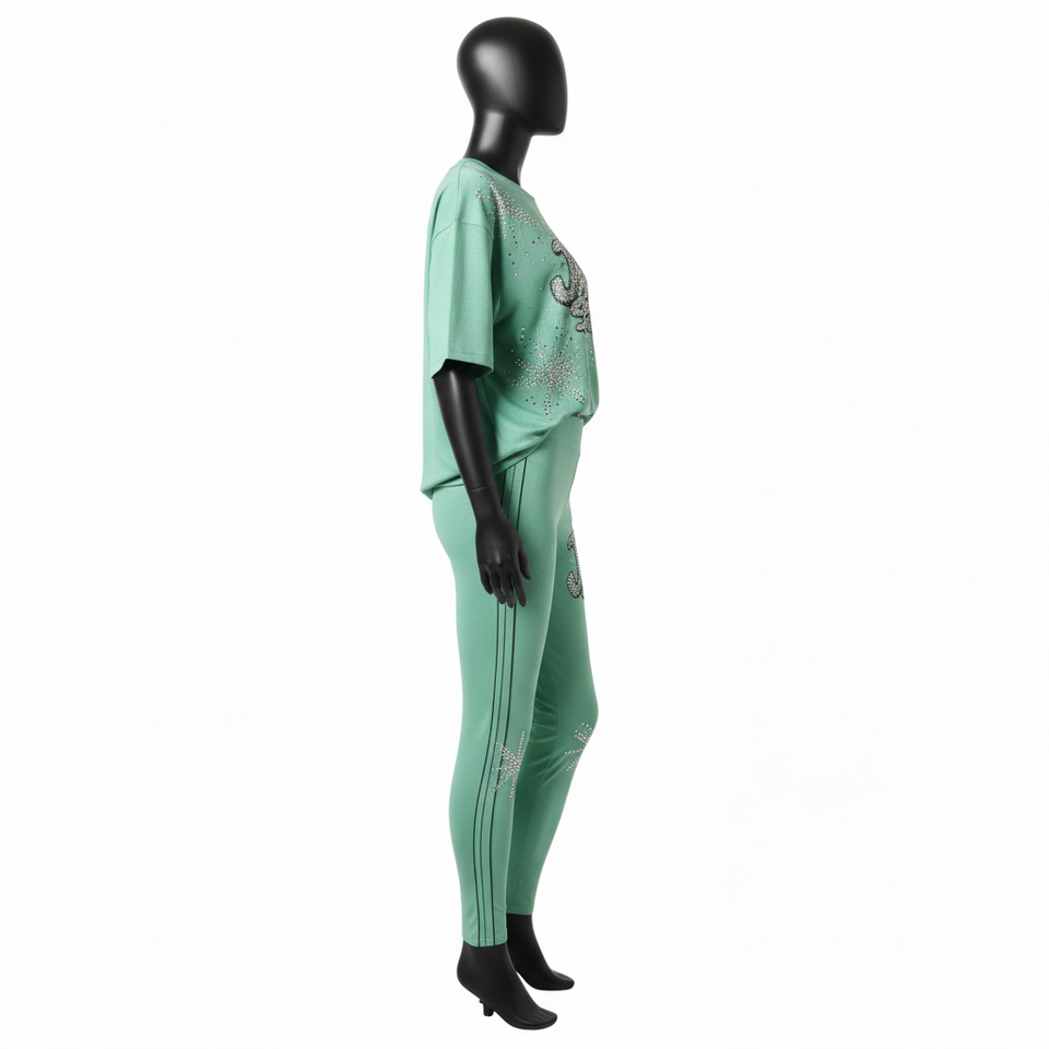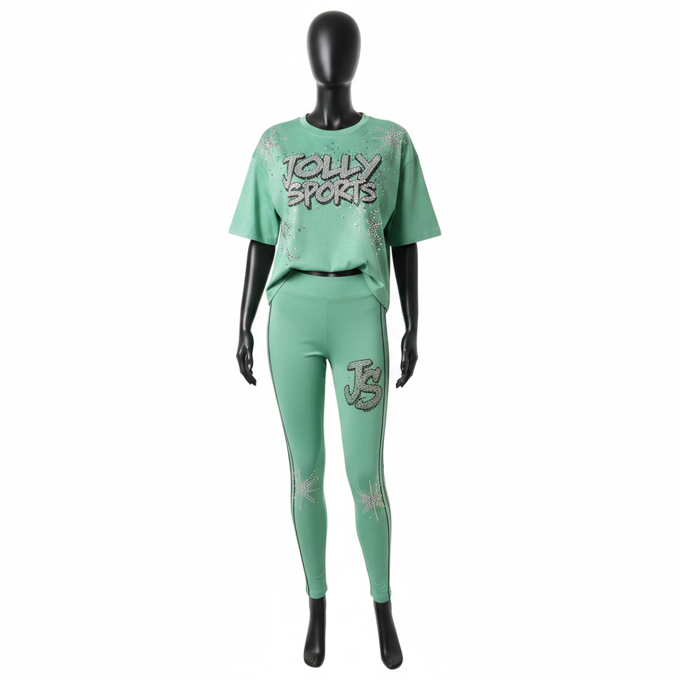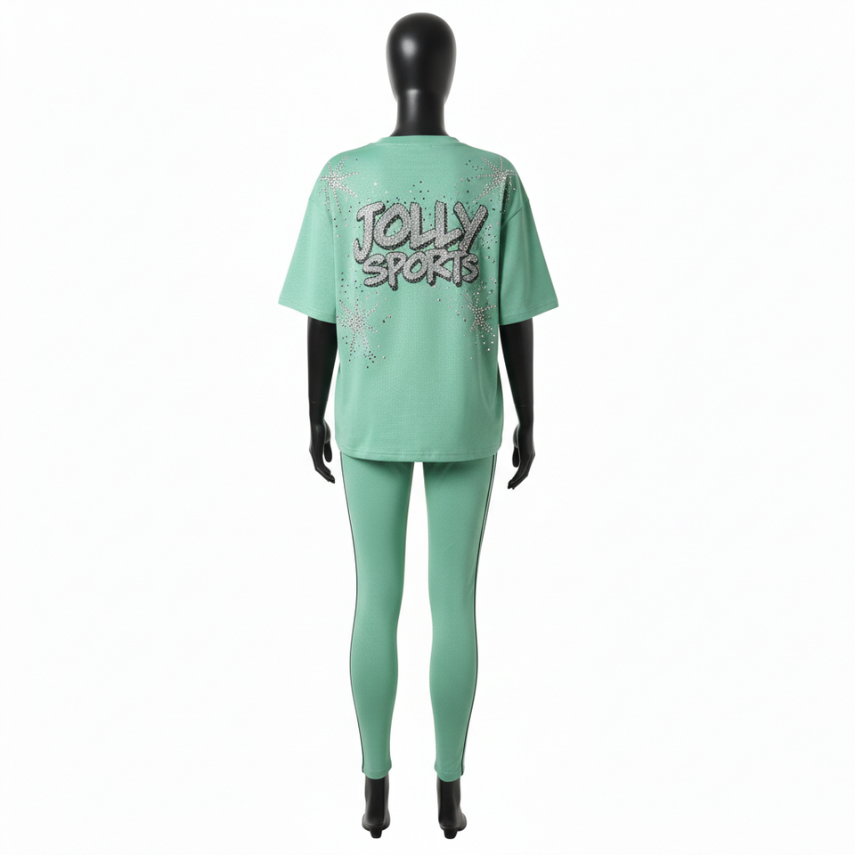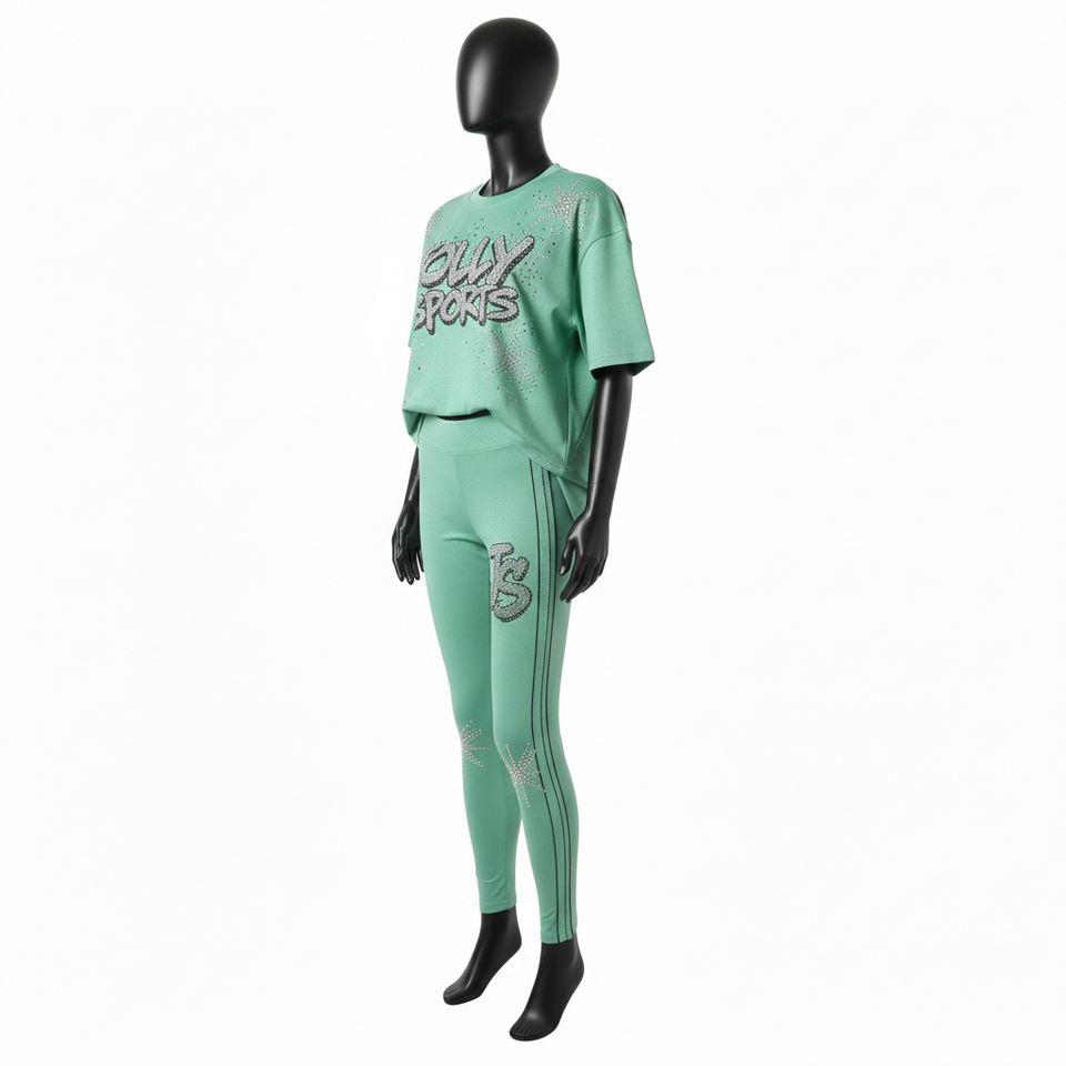 ชุดเสื้อยืดและเลกกิ้งผ้าฝ้ายผสมสแปนเด็กซ์สีเขียวมิ้นท์สำหรับผู้หญิง น้ำหนัก 220 GSM เนื้อผ้านุ่มยืดหยุ่น พร้อมโลโก้ประดับเพชรแบบกำหนดเอง