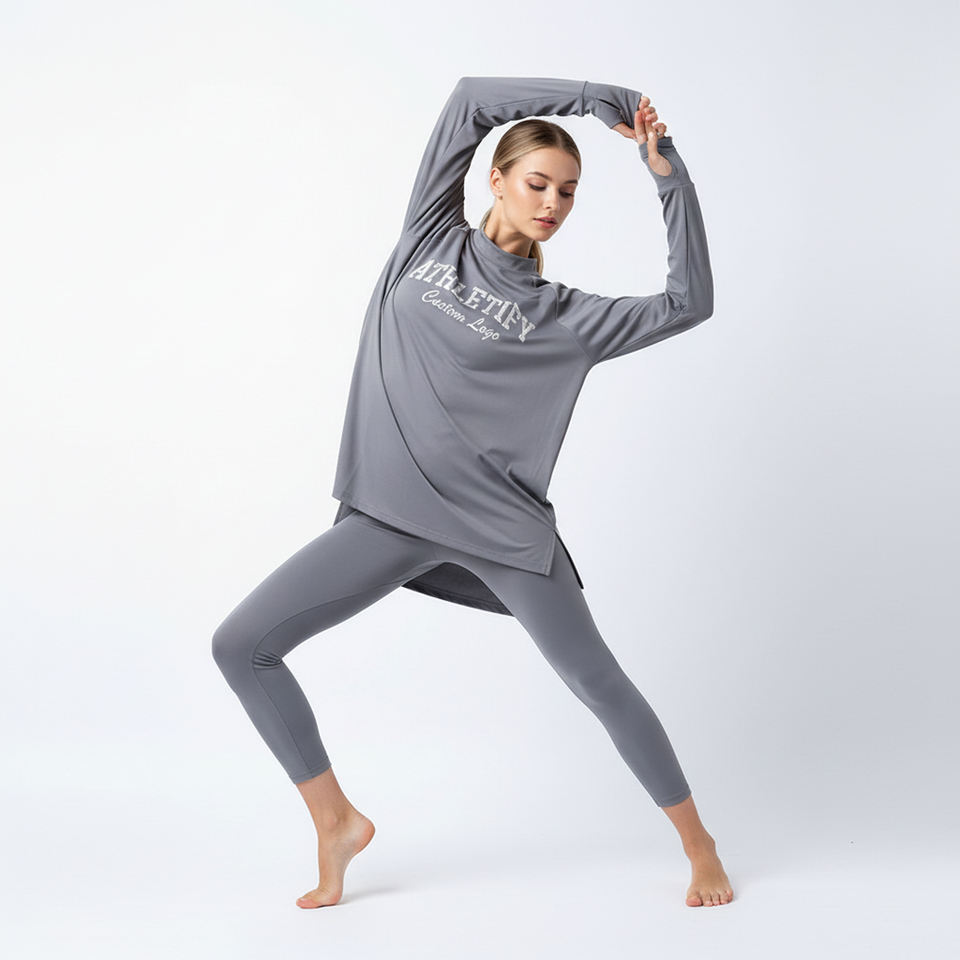 เสื้อทูนิคออกกำลังกายทรงหลวม แขนยาว สำหรับผู้หญิง ดีไซน์ชายเสื้อสูงต่ำ ระบายอากาศได้ดี น้ำหนักเบา เหมาะสำหรับยิม โยคะ วิ่ง และการฝึกซ้อม