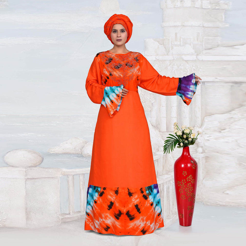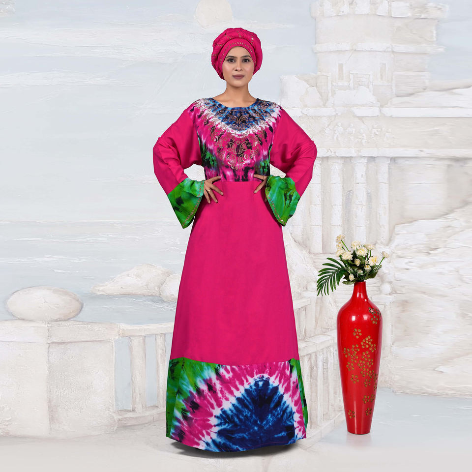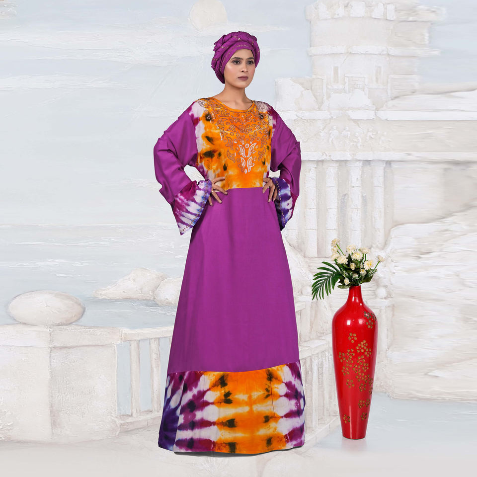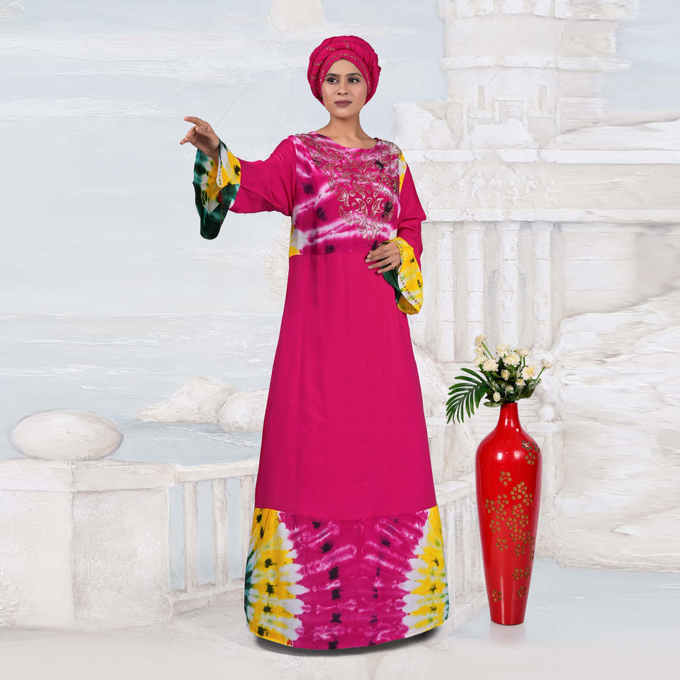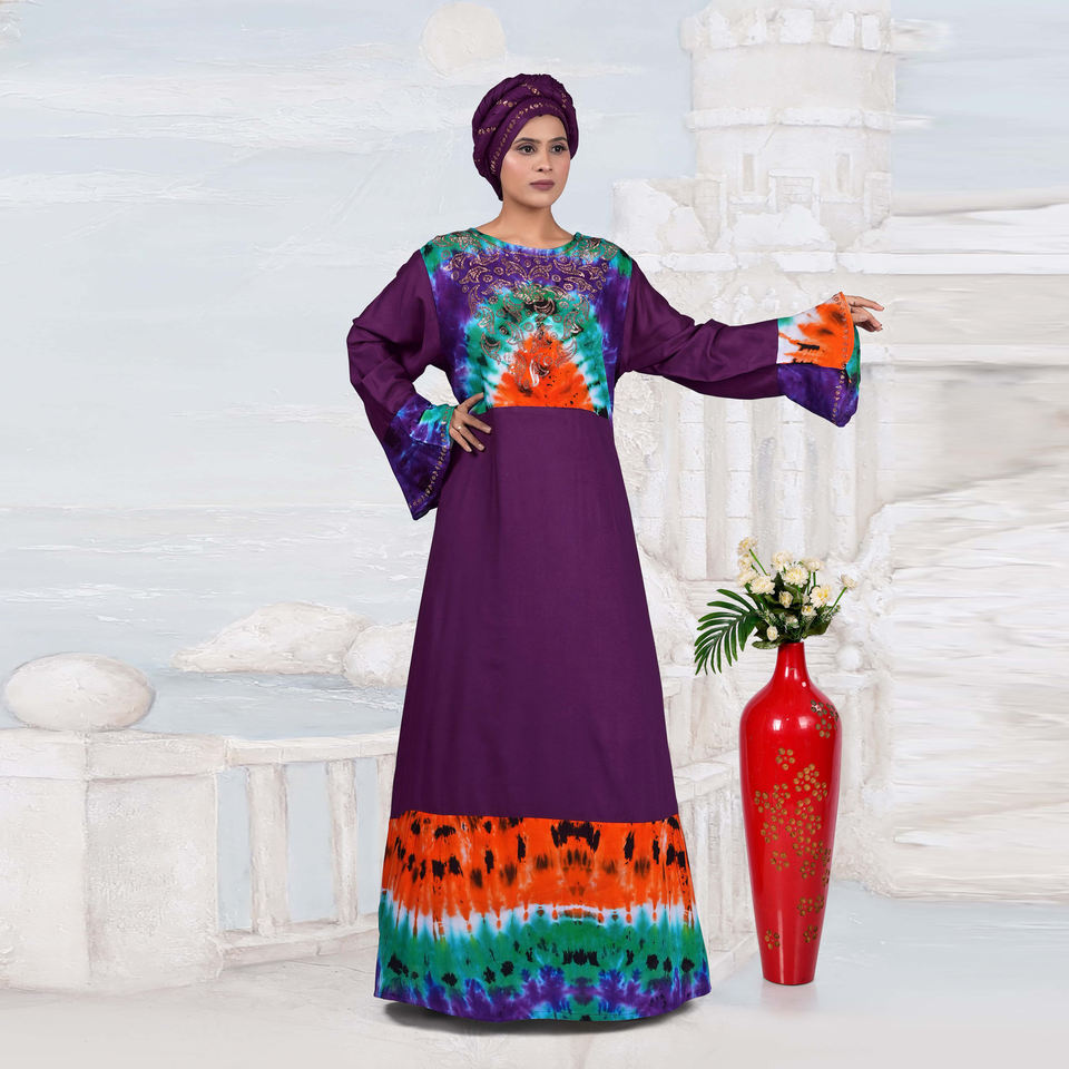 ชุดเดรสยาวแบบมุสลิมสำหรับผู้หญิง ผ้าเรยอน แต่งเพชรที่คอเสื้อ ดีไซน์ลายมัดย้อม แขนยาว เหมาะสำหรับงานปาร์ตี้