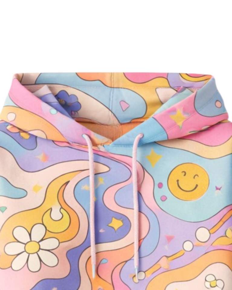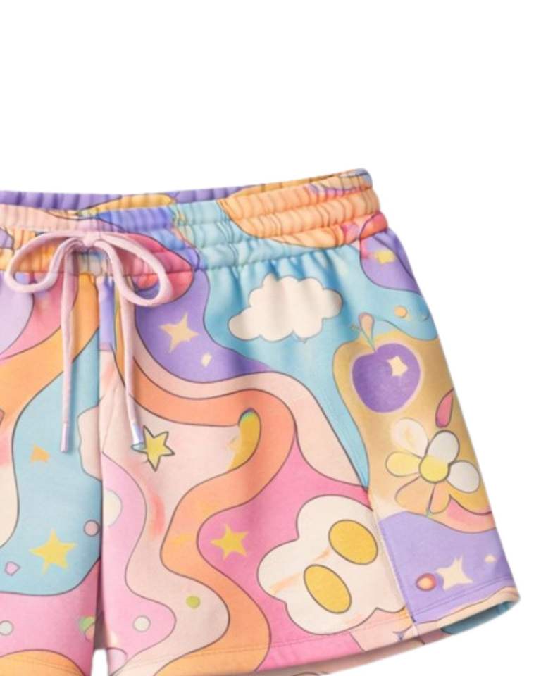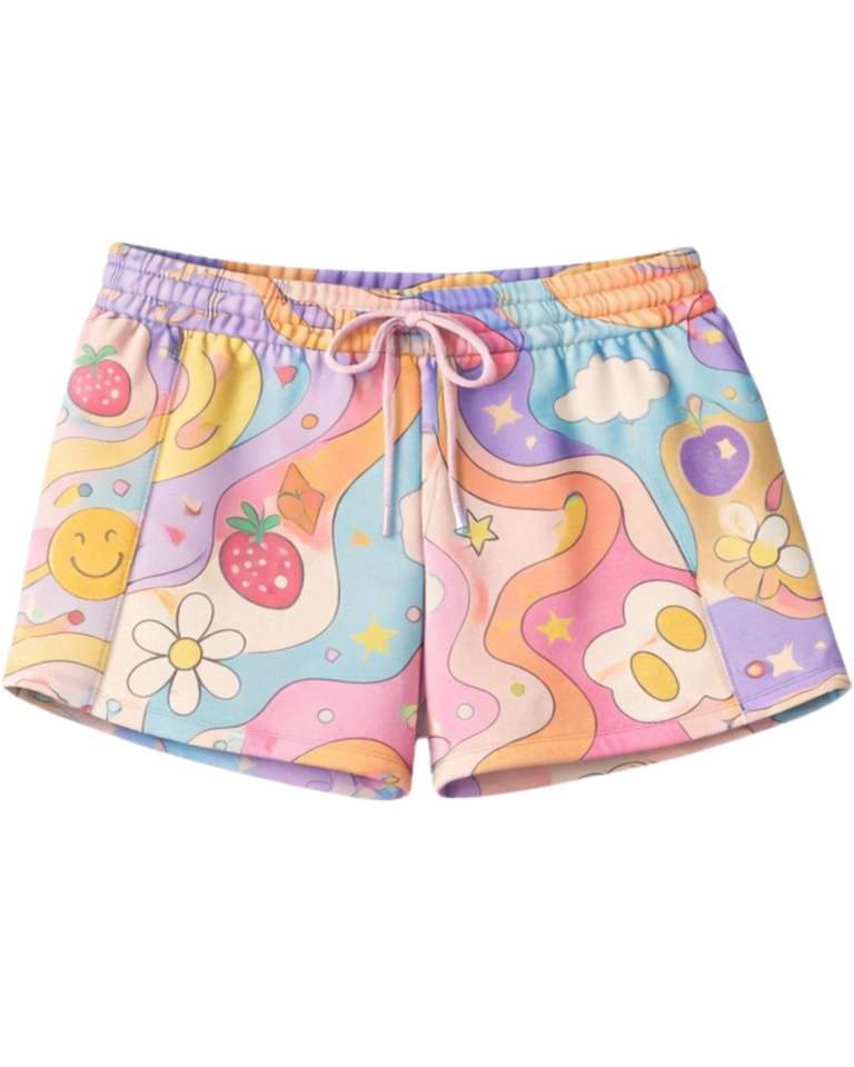 ชุดเซ็ตเสื้อครอปฮู้ดดี้และกางเกงขาสั้นหลากสีสำหรับผู้หญิง ลายการ์ตูนนามธรรม ชุดลำลองสองชิ้น ผ้าฝ้ายฟลีซ ชุดลำลองใส่สบาย ขายส่ง