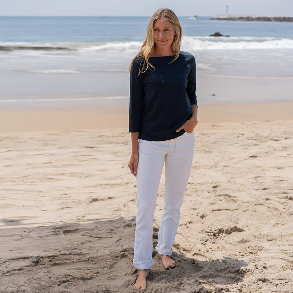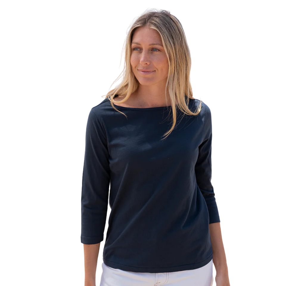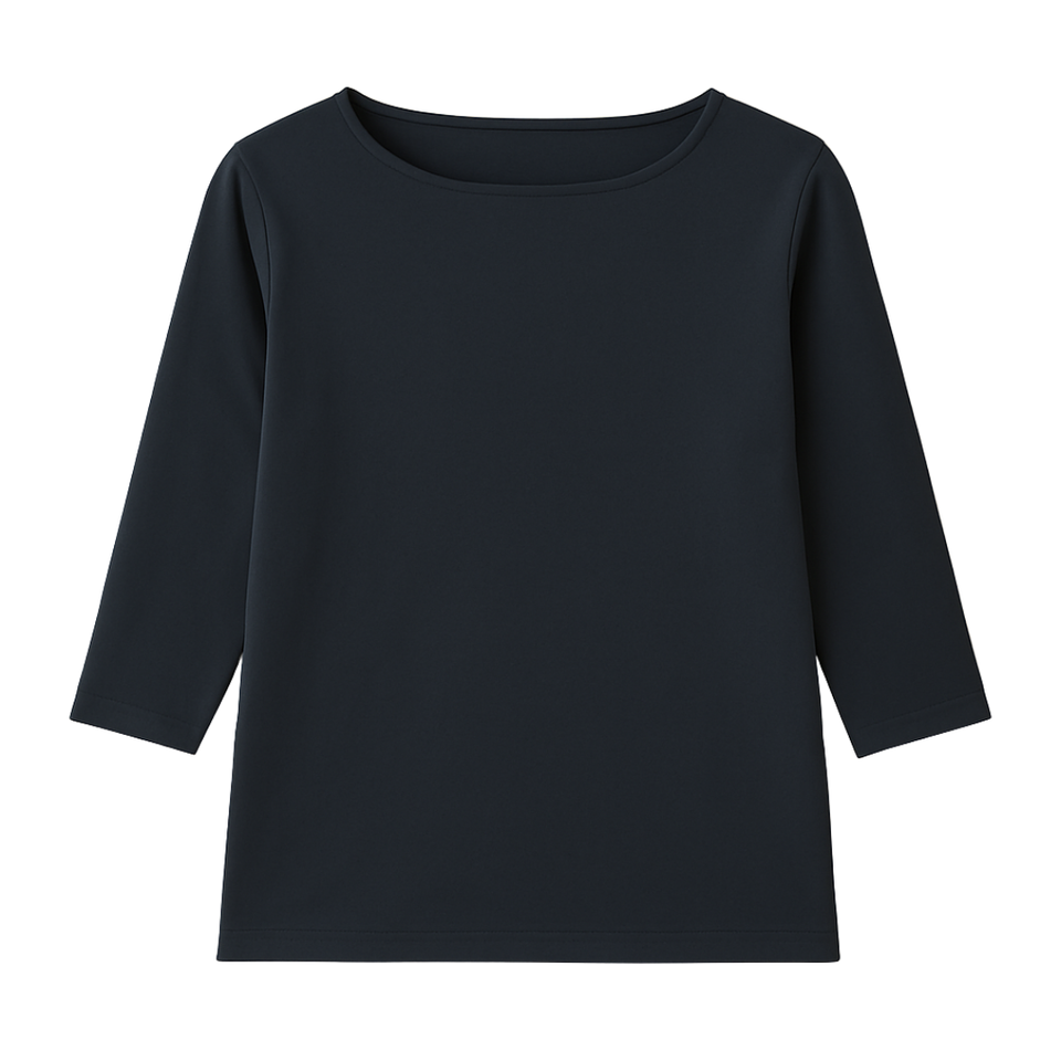 เสื้อยืดผู้หญิงสีน้ำเงินกรมท่า แขนสามส่วน คอทรงเรือ ผ้าฝ้ายออร์แกนิค 100% คุณภาพพรีเมียม ผ่านการรับรอง GOTS ผ้าเนื้อนุ่มพิเศษ ทรงคลาสสิก