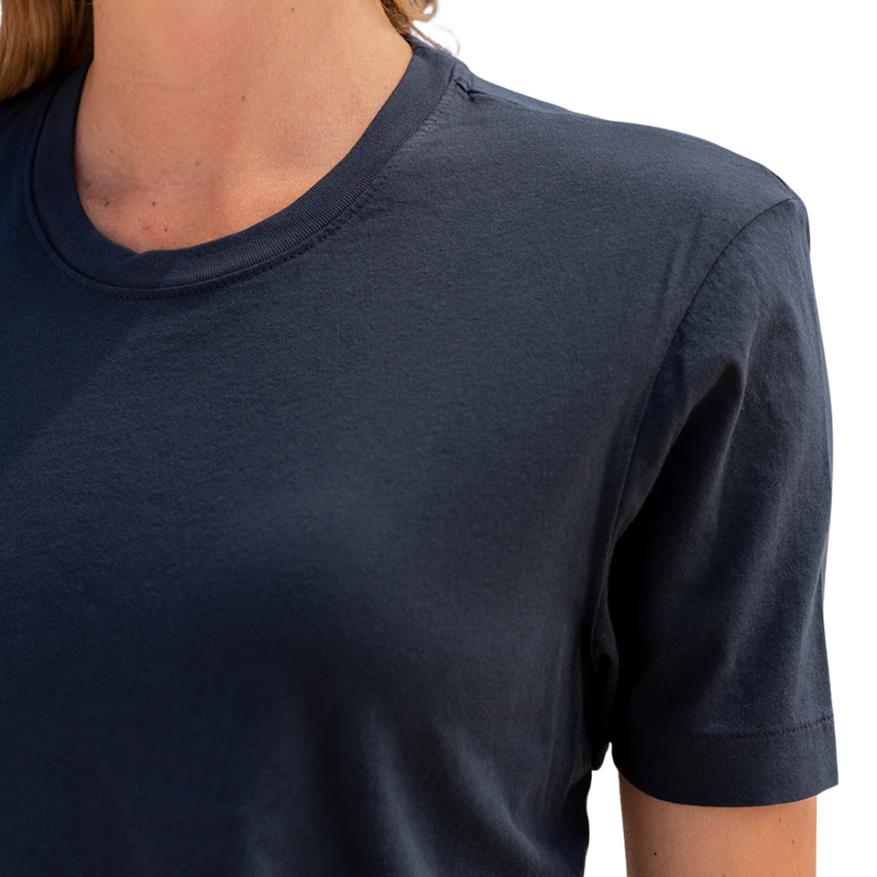 เสื้อยืดคอกลมแขนสั้นสีน้ำเงินกรมท่าสำหรับผู้หญิง ผลิตจากผ้าฝ้ายออร์แกนิคคุณภาพสูง 100% ผ่านการรับรอง GOTS เนื้อผ้านุ่ม ระบายอากาศได้ดี