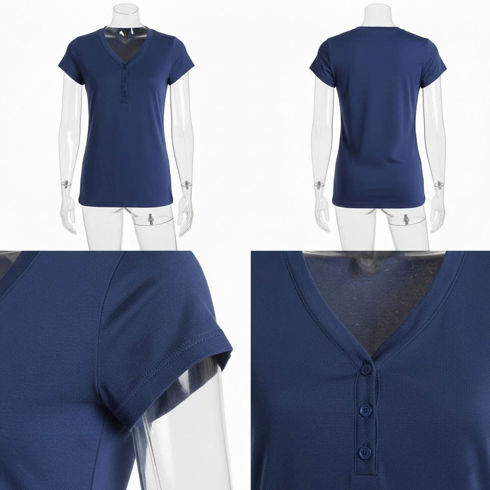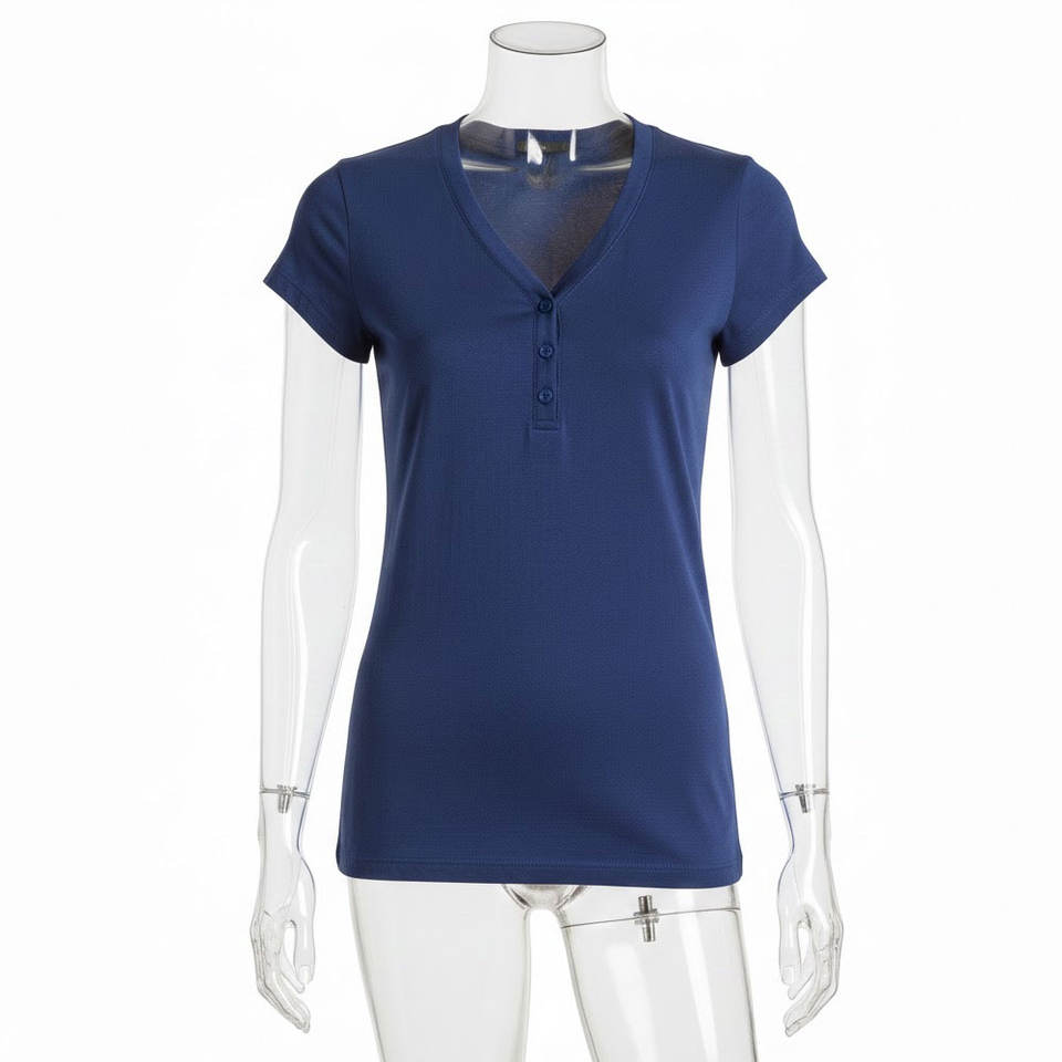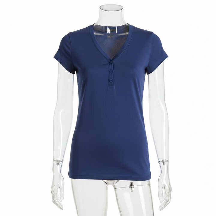 เสื้อยืดแขนสั้นคอเฮนลีย์ทรงเข้ารูปสไตล์ใหม่สำหรับผู้หญิง เสื้อลำลองแฟชั่นสำหรับสุภาพสตรี