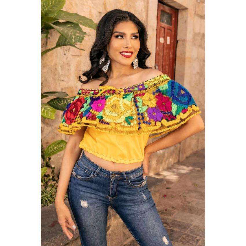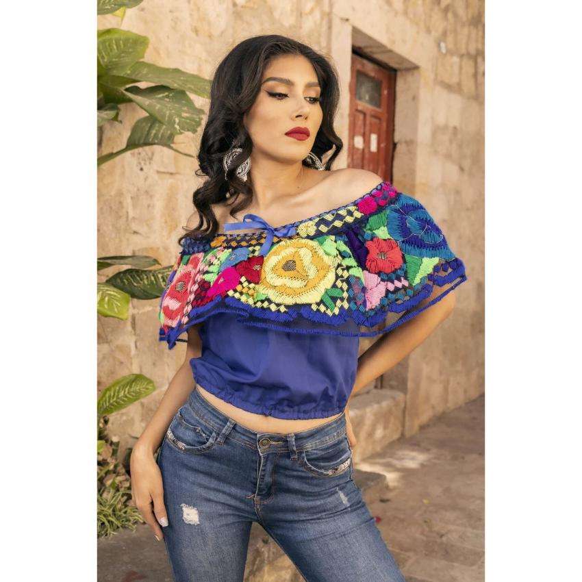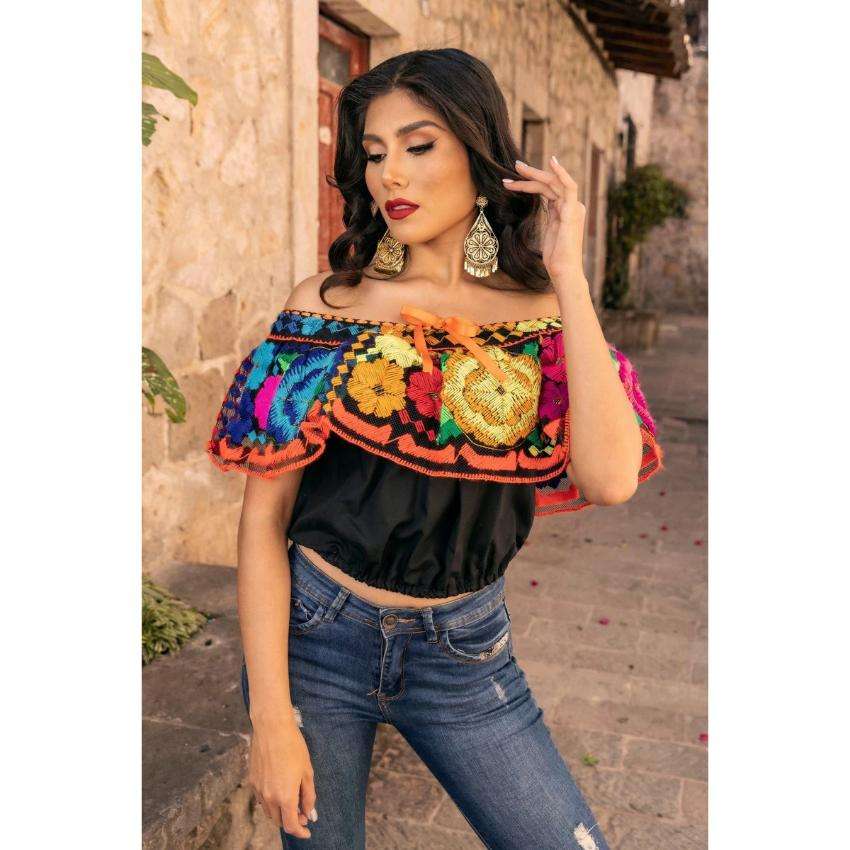 เสื้อครอปปักลายดอกไม้สไตล์โบฮีเมียนเม็กซิกันสำหรับผู้หญิง ผ้าฝ้าย เสื้อเอธนิคสำหรับฤดูร้อน