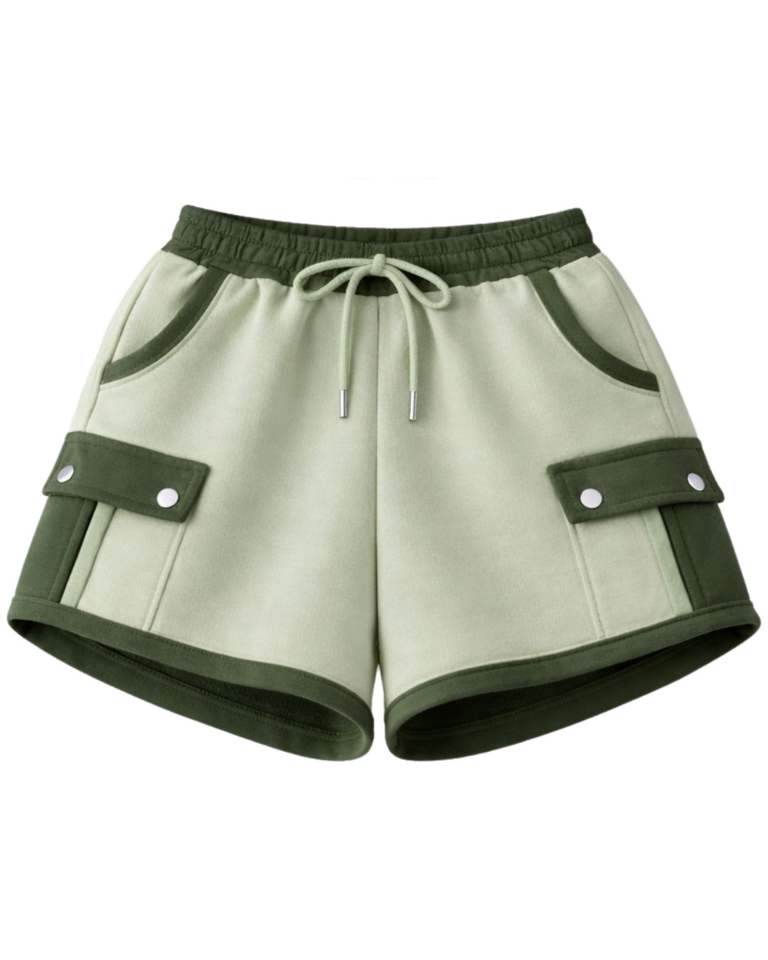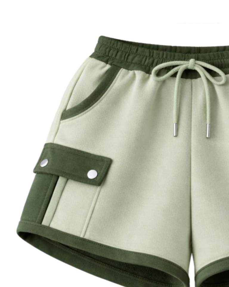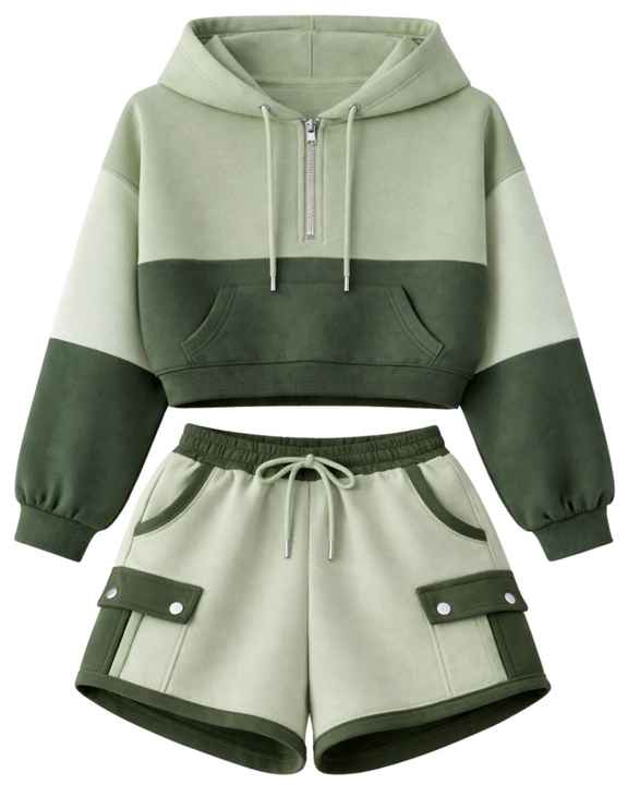 ชุดเซ็ตเสื้อครอปฮู้ดซิปสีเขียวมะกอกสำหรับผู้หญิง พร้อมกางเกงขาสั้นทรงคาร์โก้ มีกระเป๋าหลายช่อง สไตล์ลำลอง ชุดสองชิ้น ผลิตจากโพลีเอสเตอร์และผ้าฝ้าย รับผลิตตามสั่ง ขายส่ง