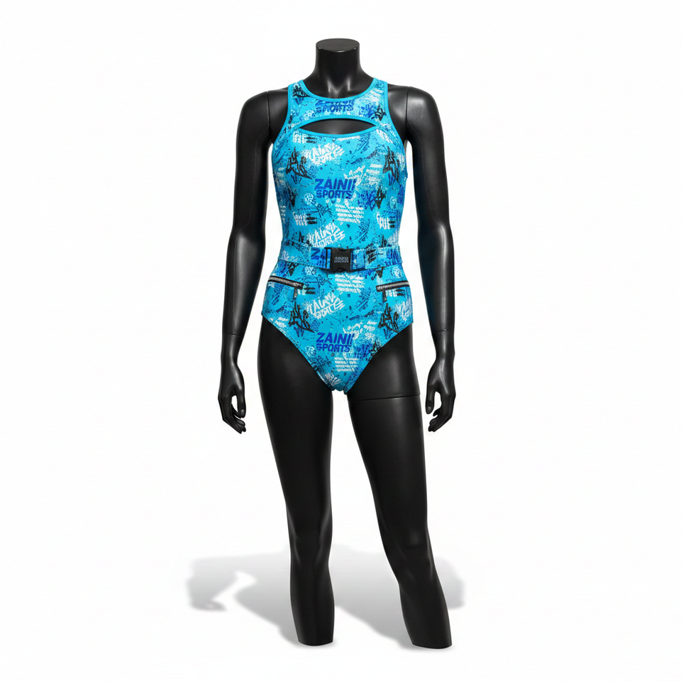 ชุดว่ายน้ำวันพีซผู้หญิง โพลีเอสเตอร์ สแปนเด็กซ์ ยืดหยุ่นได้ สีน้ำเงิน ลายกราฟิก รับสกรีนโลโก้สำหรับชุดว่ายน้ำผู้หญิง