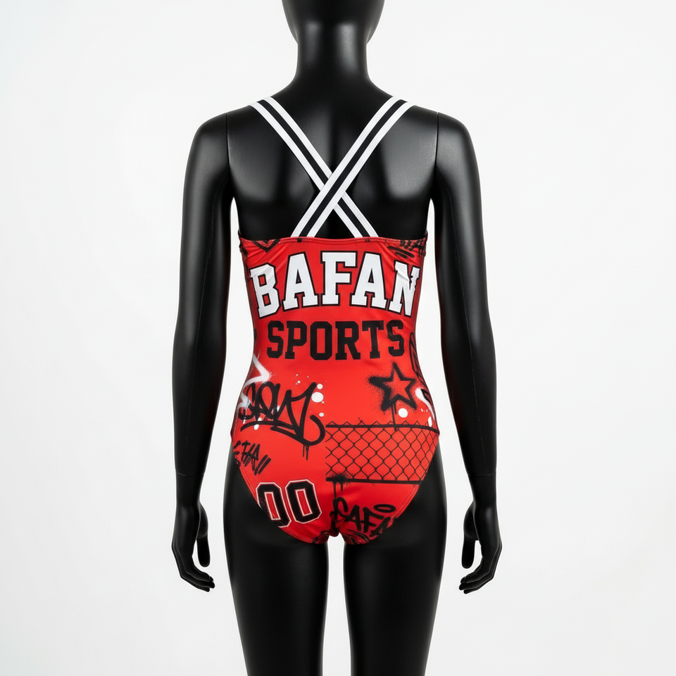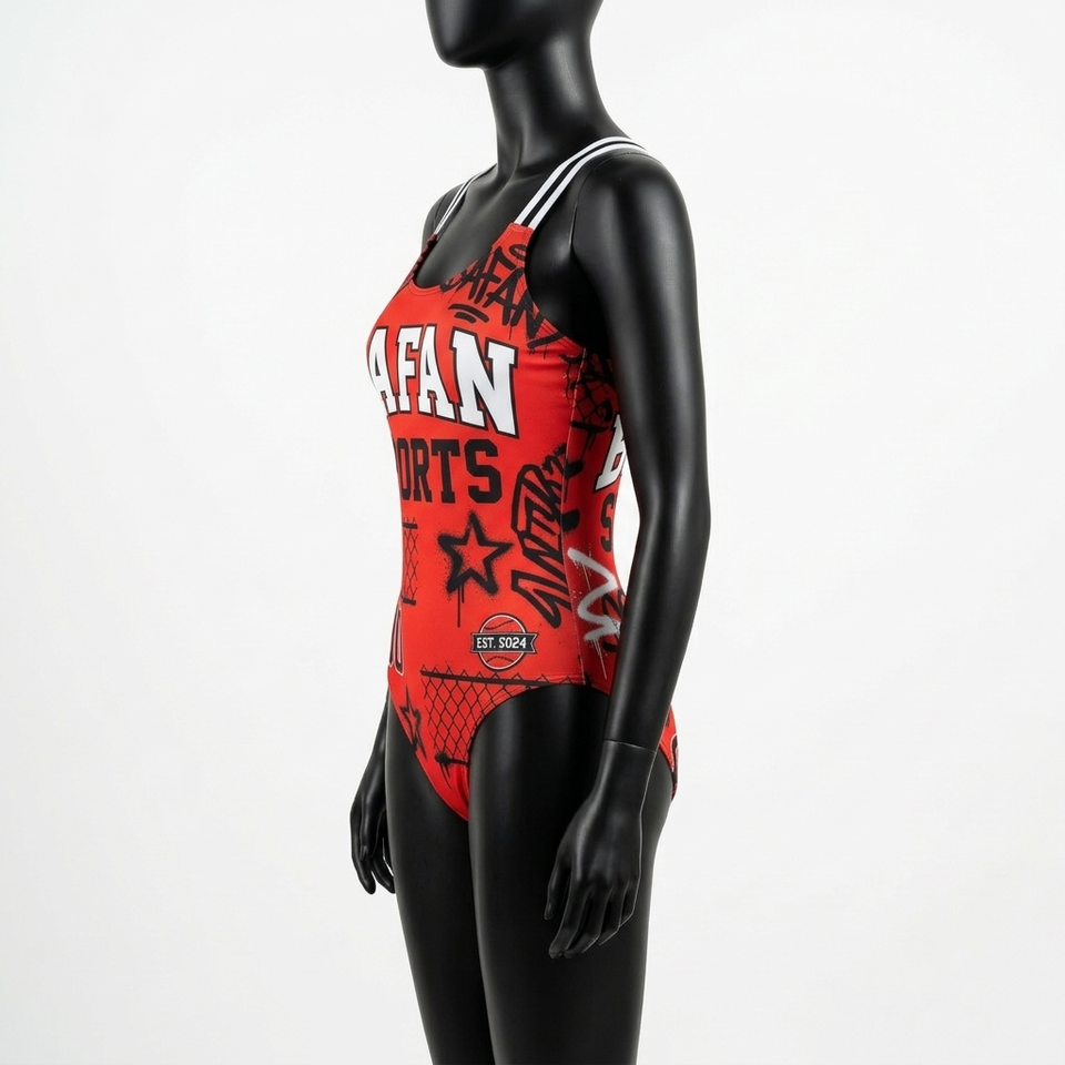 ชุดว่ายน้ำวันพีซผู้หญิง ผ้าโพลีเอสเตอร์ผสมสแปนเด็กซ์ ยืดหยุ่นได้ สีแดง ดำ ขาว แบบแผง รับสกรีนโลโก้สำหรับชุดว่ายน้ำผู้หญิง