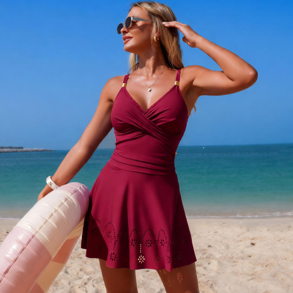 Women One Piece Swimsuit Solid Color Deep V Neck Hollow Stretch Skirt Style Beachwear for Swimming Water Sports Polyester Lining