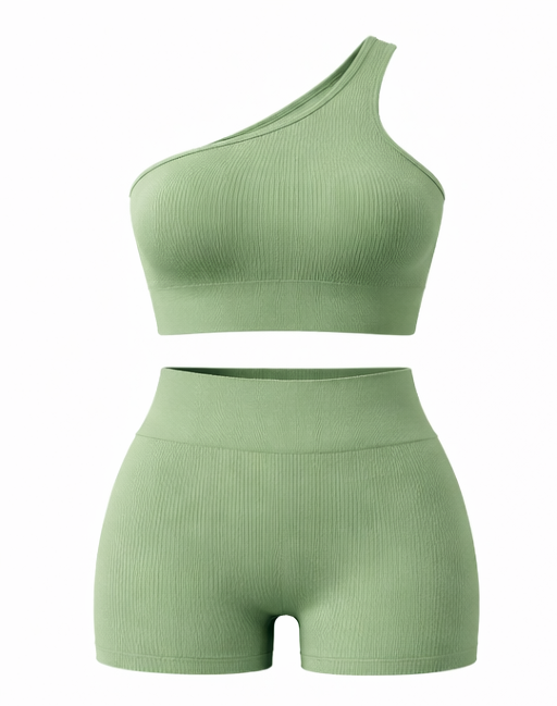 ชุดออกกำลังกายผู้หญิงแบบไร้รอยต่อ เสื้อครอปไหล่เดียว กางเกงขาสั้นเอวสูง ชุดโยคะ ชุดฟิตเนส ชุดกีฬา ชุดลำลอง